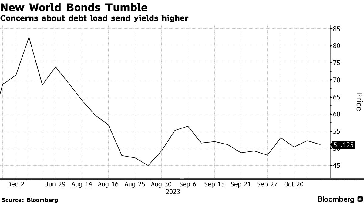 新世界的股价今年已经下跌了47%,跌至20年来的最低点,而恒生指数的跌幅为14%。该开发商于2019年发行的13亿美元永续债券仅以每美元51美分的价格交易。