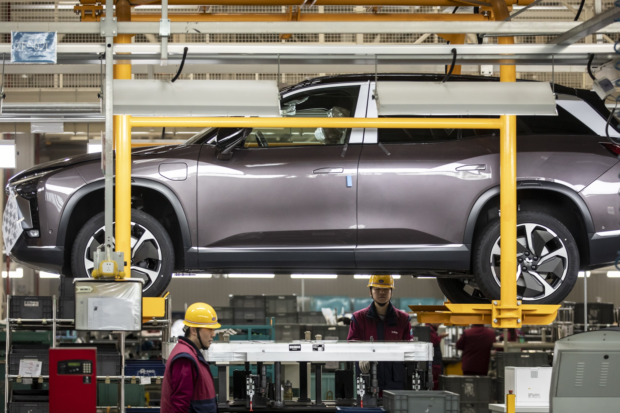 工人们在中国合肥的蔚来公司生产基地为一辆电动SUV安装电池。