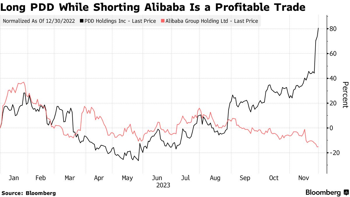配对交易策略通常涉及两个相关证券——做空其中一个,同时做多另一个。表现差距越大,交易就越有利可图。拼多多今年迄今上涨了超过80%,而阿里巴巴在美国交易中下跌了15%。随着一些人认为行业重组刚刚开始,这项交易可能还有进一步发展的空间。