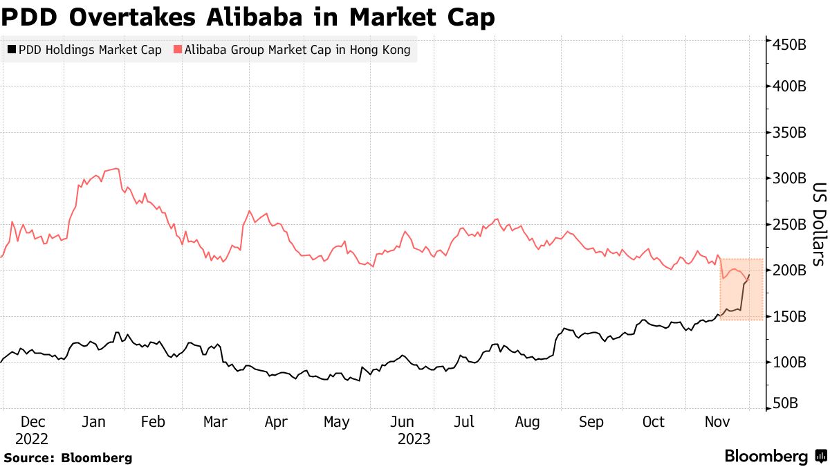 拼多多——这家成立八年的新兴公司以其热门的“特拇”市场而闻名——周四在美国交易市场收盘时的市值约为1960亿美元,首次超过了阿里巴巴的价值。拼多多今年迄今涨幅超过80%,而阿里巴巴在美国交易中下跌了15%。