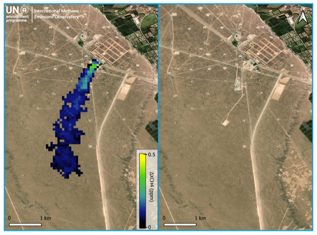 阿根廷一起甲烷泄漏事件在3月得到控制前后的卫星图像。“这是我们如何真正将这些数据变得可操作的第一个例子,” IMEO负责人曼弗雷迪·卡尔塔吉罗内在一次采访中说道,他指的是一批新一代卫星,使科学家们能够追踪全球甲烷排放。“这只是我们预计将会有很多用例中的第一个,这些数据和这些能力将给我们带来。”