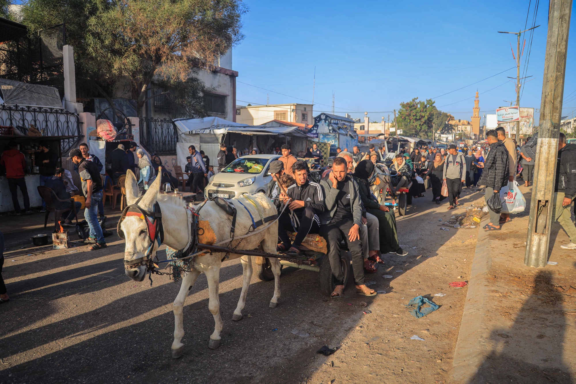 流离失所的人们在加沙南部汗尤尼斯用马车搬运他们的财产,这是11月的事。