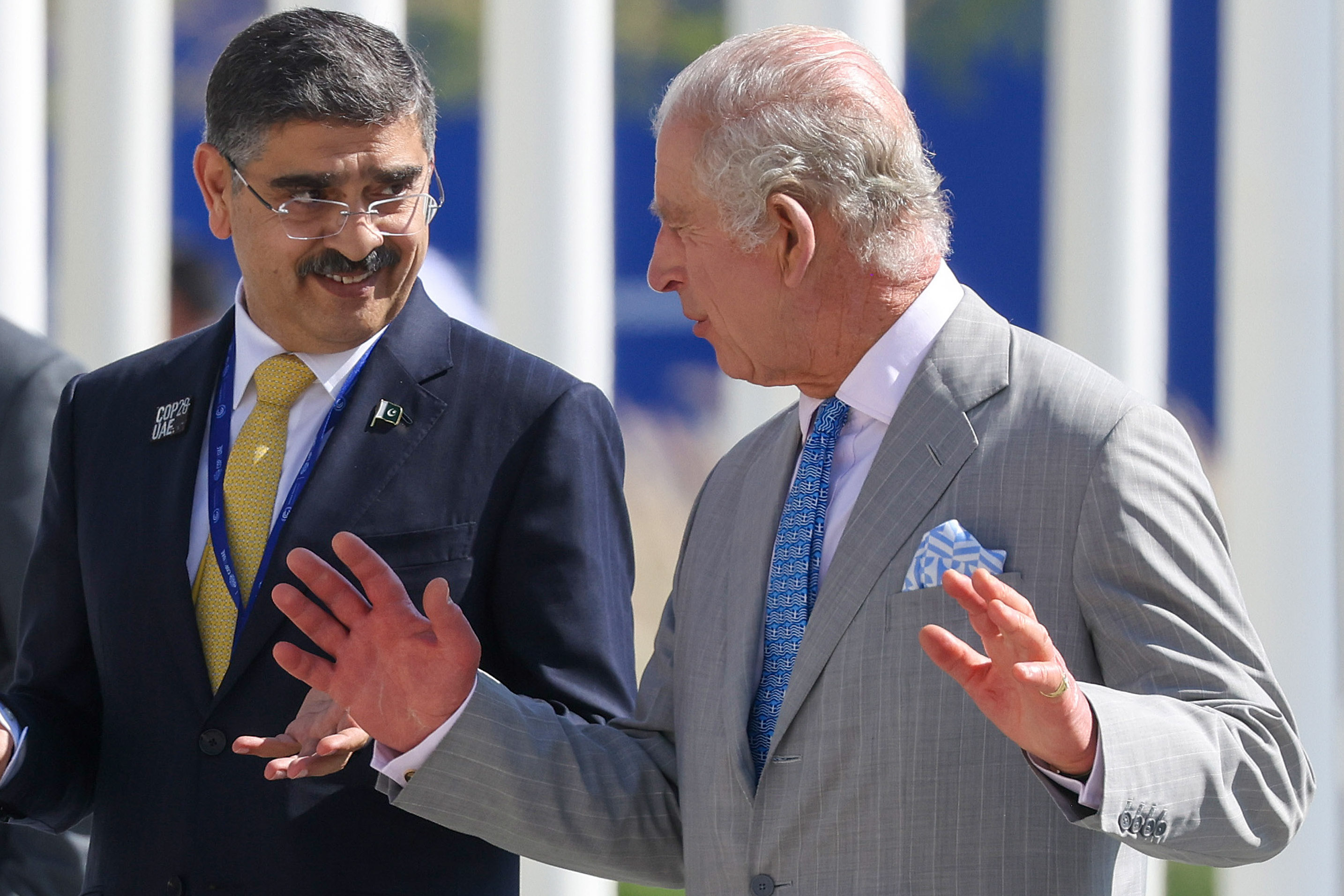 安瓦尔-乌尔-哈克·卡卡尔,巴基斯坦总理,在COP28第二天与查尔斯三世国王交谈摄影师:Hollie Adams/Bloomberg但查尔斯是否还有其他使命?《希腊城市时报》认为是这样 - 他的蓝白领带反映了国家的国旗,因此在英国和希腊之间的外交争端之后,这是一个和平信号历史悠久的巴特农神庙雕塑。