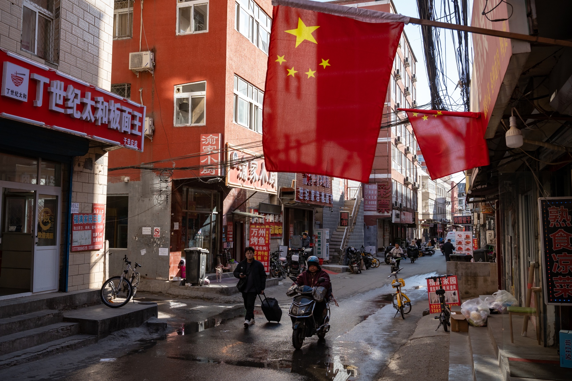 北京村庄里的中国国旗。摄影师:Andrea Verdelli/Bloomberg你好,我是上海的Allen Wan。