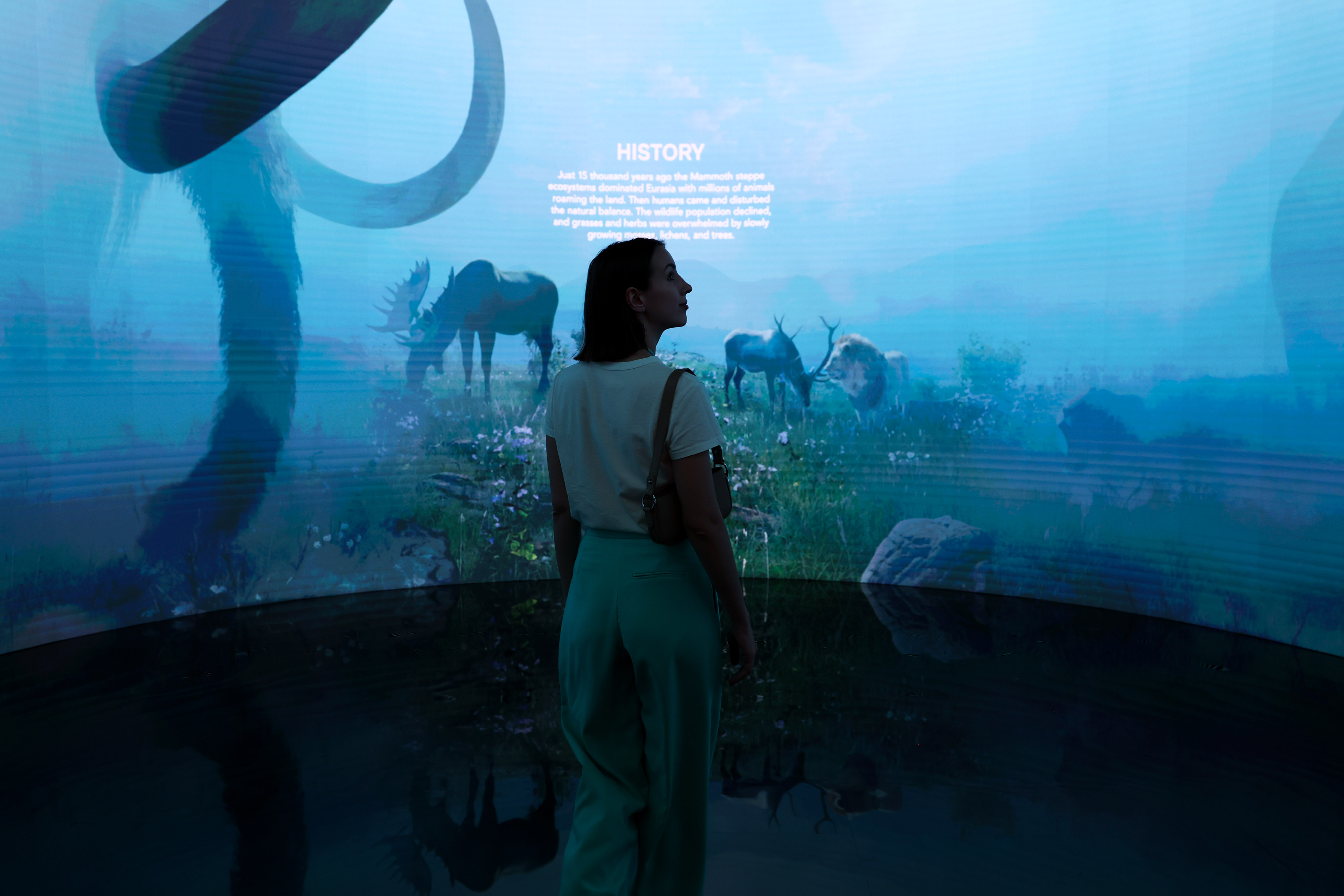在接下来的两周里,超过7万名代表和成千上万的阿联酋居民将参观举办COP的庞大场馆,并有机会在沉浸式展览的屏幕上看到冰河时代动物在春季苔原上移动的数字动物园。当游客行走时,数字雾围绕着他们消散,显现出猛犸象、驯鹿、野马和麝牛,以及狮子和骆驼。