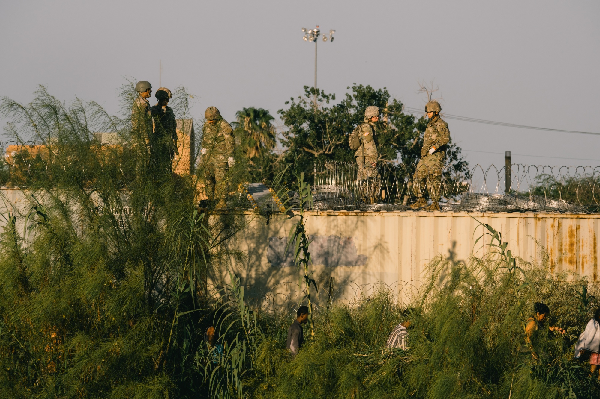 移民们在美国德克萨斯州鹰港的里约格兰德河下方与国民警卫队成员一同行走。