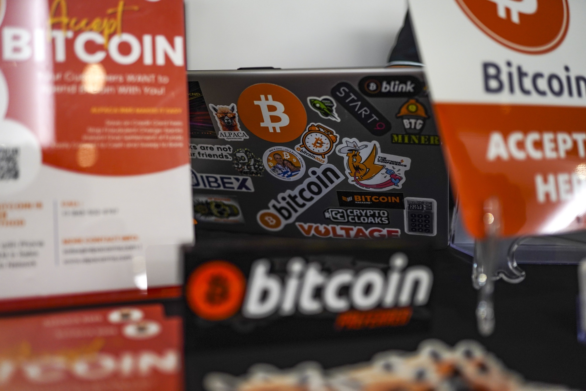 在11月的萨尔瓦多圣萨尔瓦多举行的采用比特币2023峰会上,笔记本电脑上贴着贴纸。