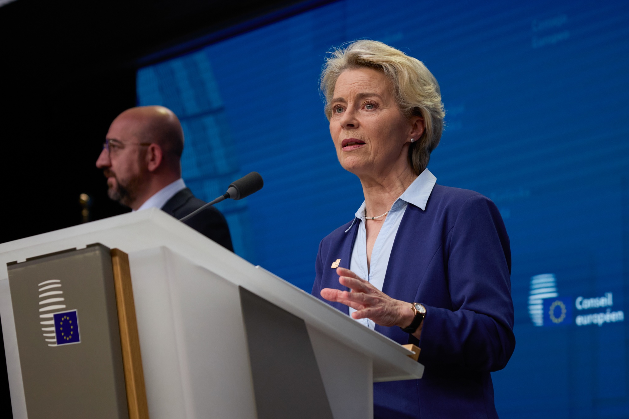 乌尔苏拉·冯·德·莱恩和查尔斯·米歇尔,左。