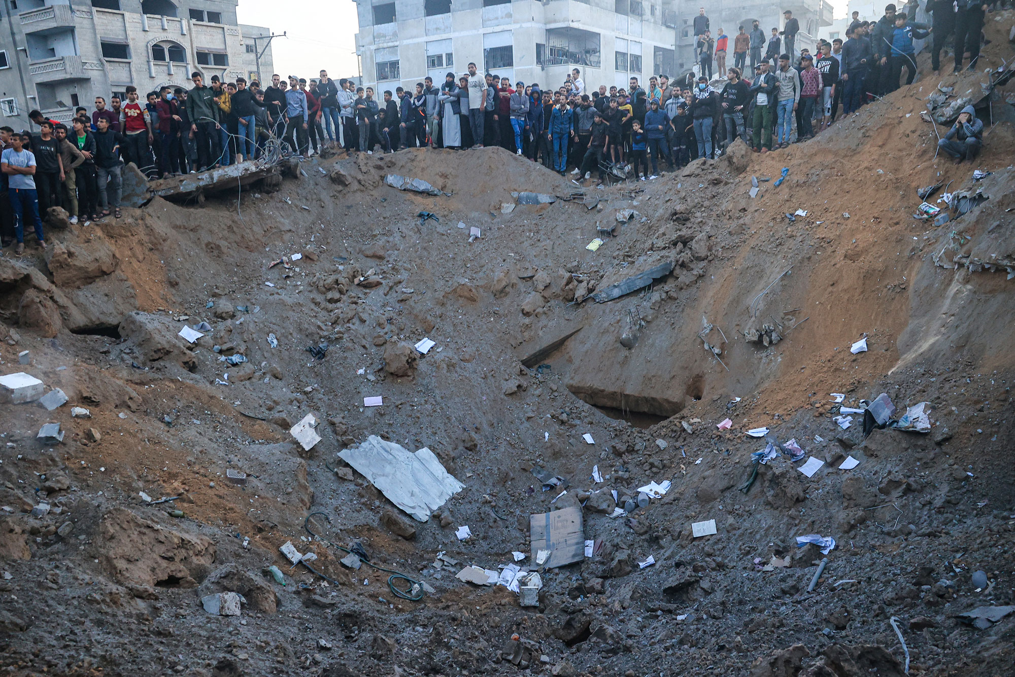 巴勒斯坦人站在加沙拉法区一处弹坑边缘,这是以色列12月3日的一次打击。摄影师:赛义德·卡蒂卜/法新社/盖蒂图片社### “尽可能精准”