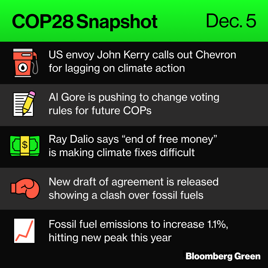 摄影师:Hollie Adams/Bloomberg 迪拜晚上好。今天我们听到了美国气候特使约翰·克里和前副总统阿尔·戈尔在彭博绿色峰会上发表了一些激烈的言论。您可以在这里了解当天的重点*。*
