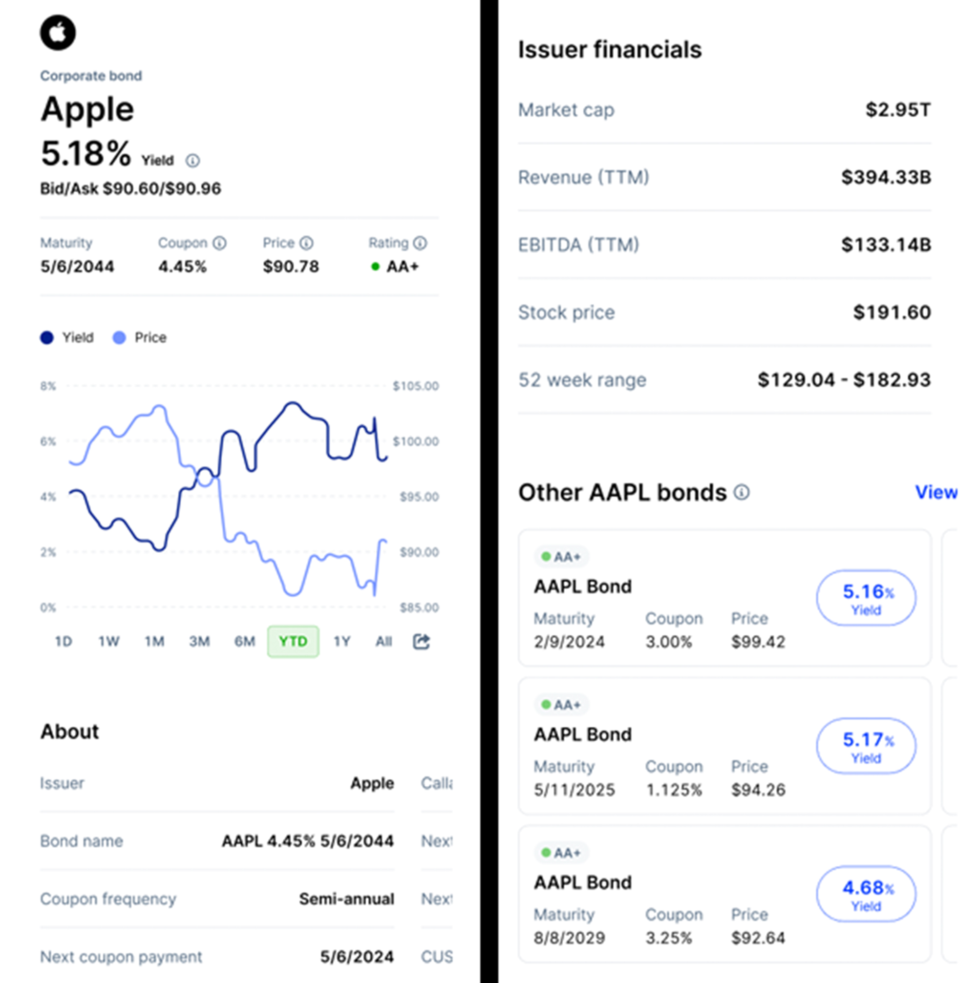 Public的界面允许债券在投资者搜索公司股票时弹出。例如,如果投资者查看苹果公司的股票,他们还会看到其到期日为2024年、2025年和2029年的债券。该经纪机构还一直在进行固定收益教育和风险因素方面的工作,以补充债券产品。