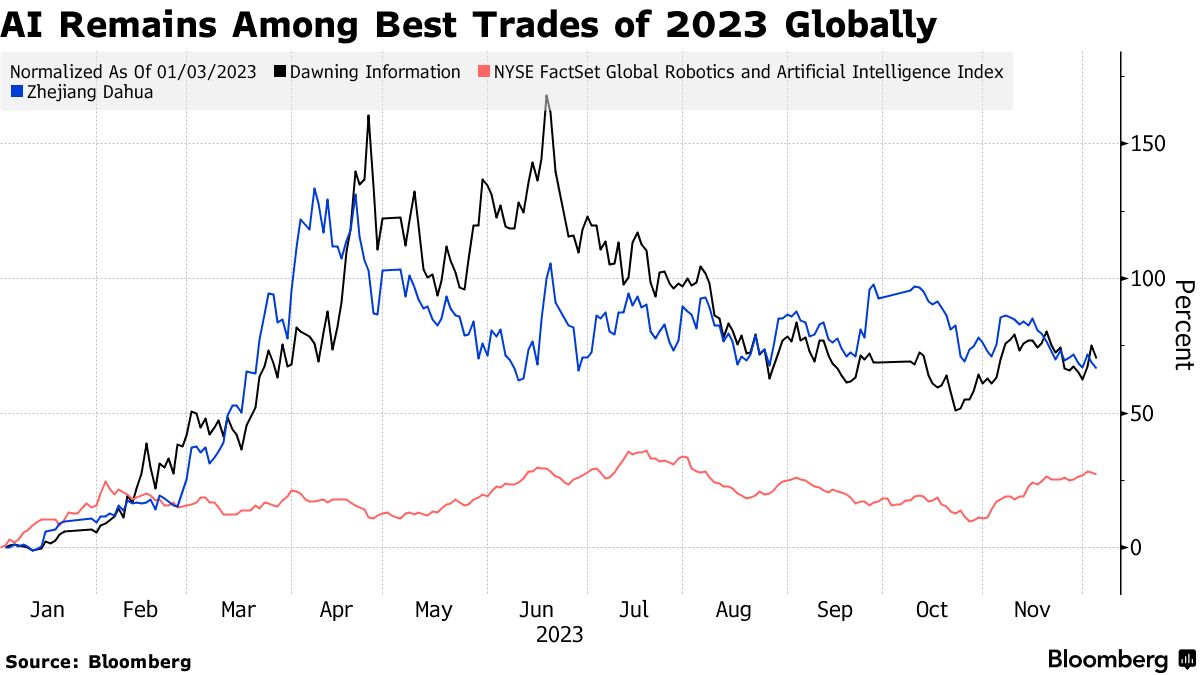 云冰望来源:彭博社在中国,今年标准指数前十名中有六家公司受到人工智能投注的提振,其中大唯信息产业股份有限公司的股价上涨了73%,引领了这一浪潮。根据东方财富网站的数据,今年领先的股票型基金也将受益于该交易的软件、媒体和芯片股票列为其最大持股。