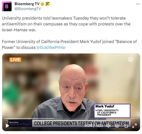 今天在彭博电视台的权力平衡节目中,主持人安玛丽·霍登和乔·马修将采访共和党参议员比尔·哈格蒂,谈论今天与顶级银行高管的听证会。在昨天的节目中,前加利福尼亚大学校长马克·尤多夫讨论了大学如何应对仇恨言论。
