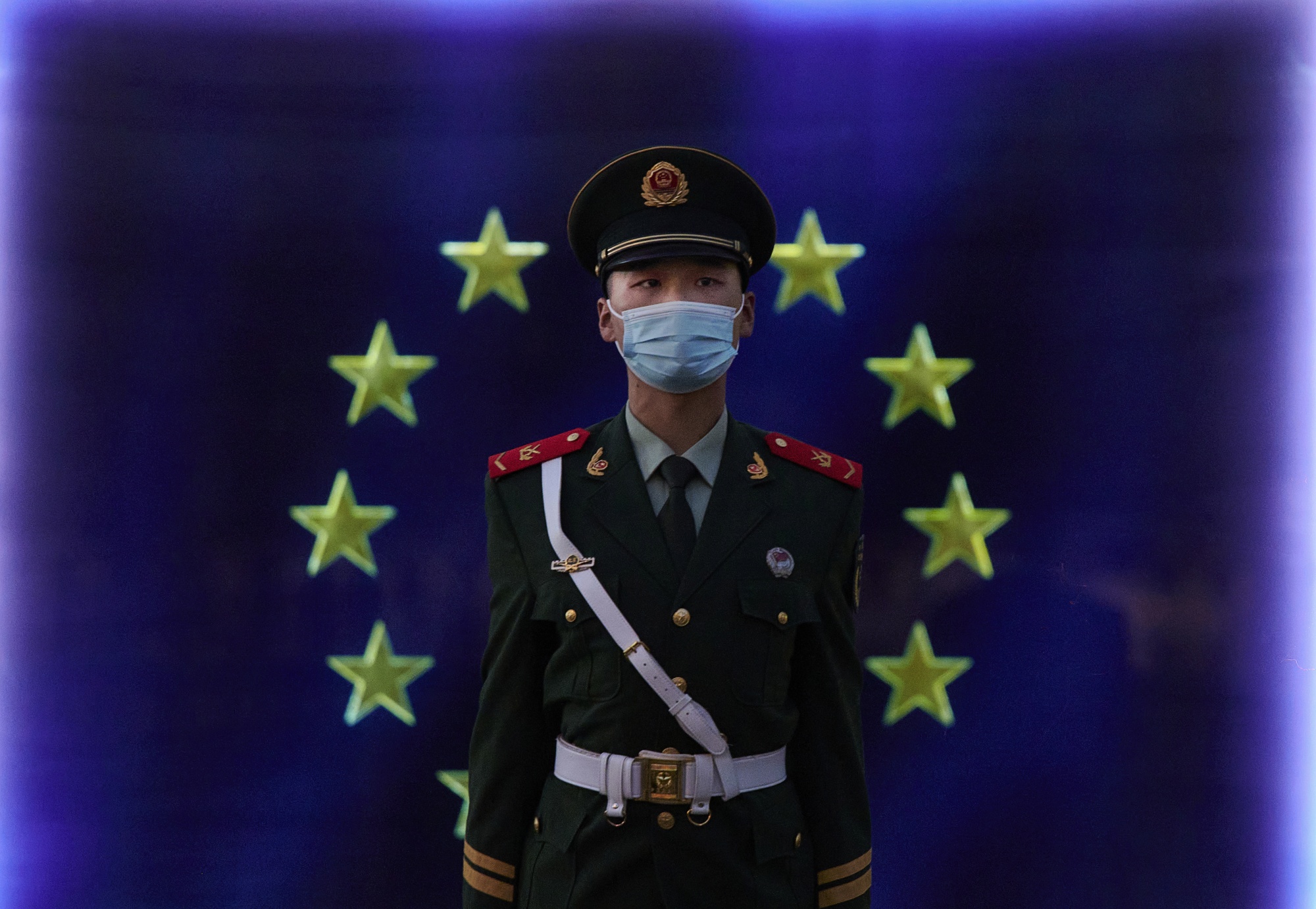 中国人民武装警察的一名成员在4月6日站在欧盟旗帜前站岗。