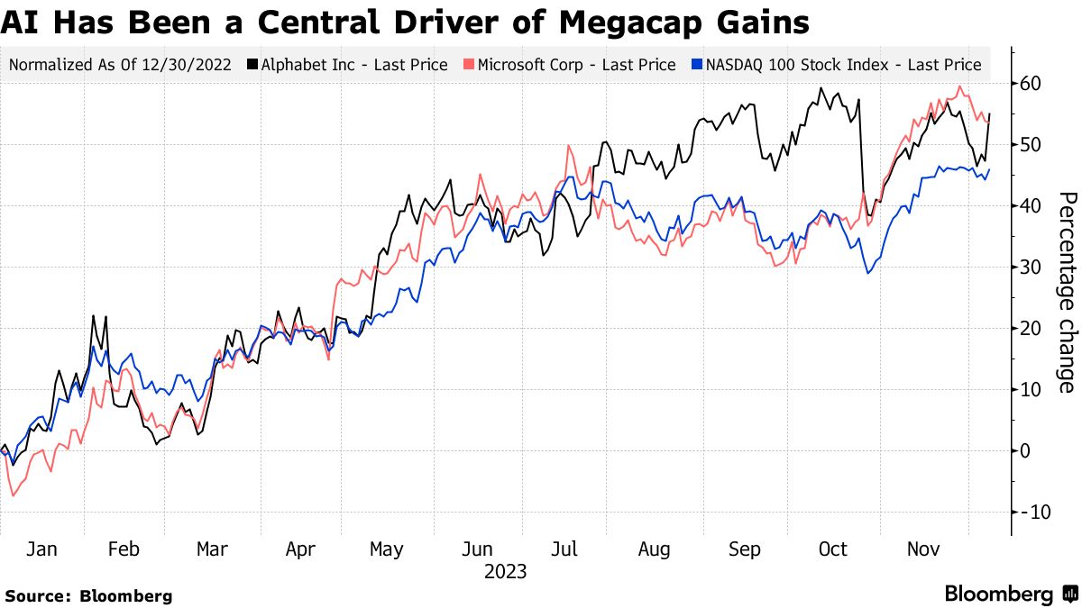 对人工智能的乐观情绪一直是今年股价上涨的主要推动力,特别是在大型科技和互联网股中。除了谷歌母公司Alphabet和微软之外,芯片制造商英伟达公司在其人工智能处理芯片需求强劲的推动下股价上涨了两倍以上。此外,先进微设备公司本周推出了一系列新的人工智能芯片,今年股价也将近翻了一番。
