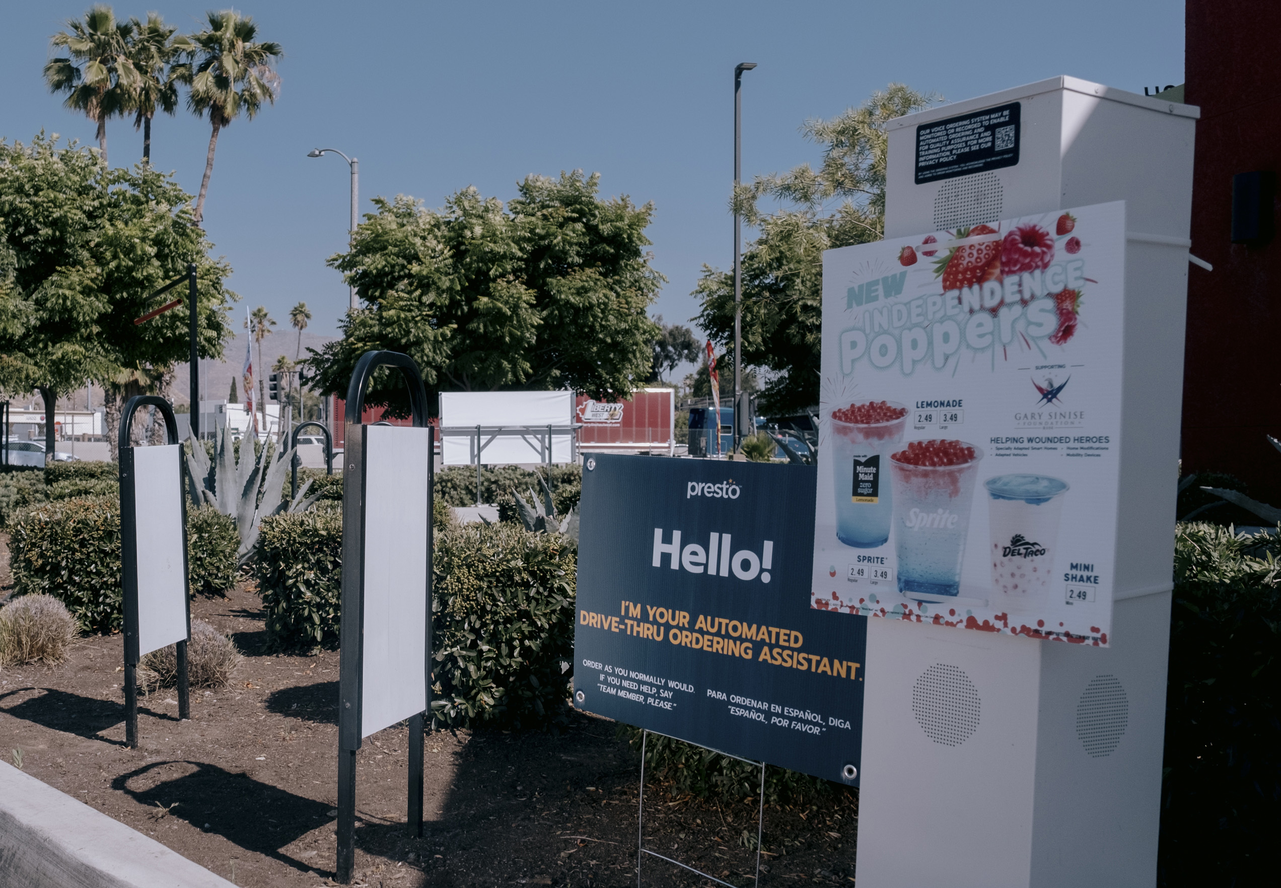 加利福尼亚州河滨市的 Del Taco 门店的标志告诉顾客“按照您通常的方式下单”,使用 Presto Automation 的点餐助手。