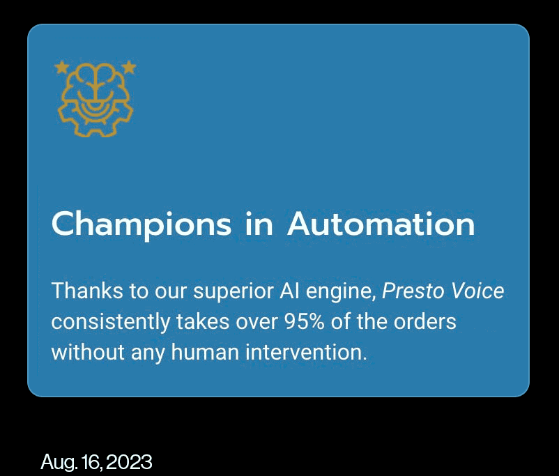 人工智能的承诺吸引了一直在努力寻找足够员工的美国餐饮行业,同时为他们雇佣的员工支付更多薪水。Presto和其他供应商推销语音聊天机器人以加快订购速度,销售额外产品如甜点,并提高准确性。这很吸引人,因为根据Intouch Insight的一项研究,驱车通道可能会有多达14%的订单错误。