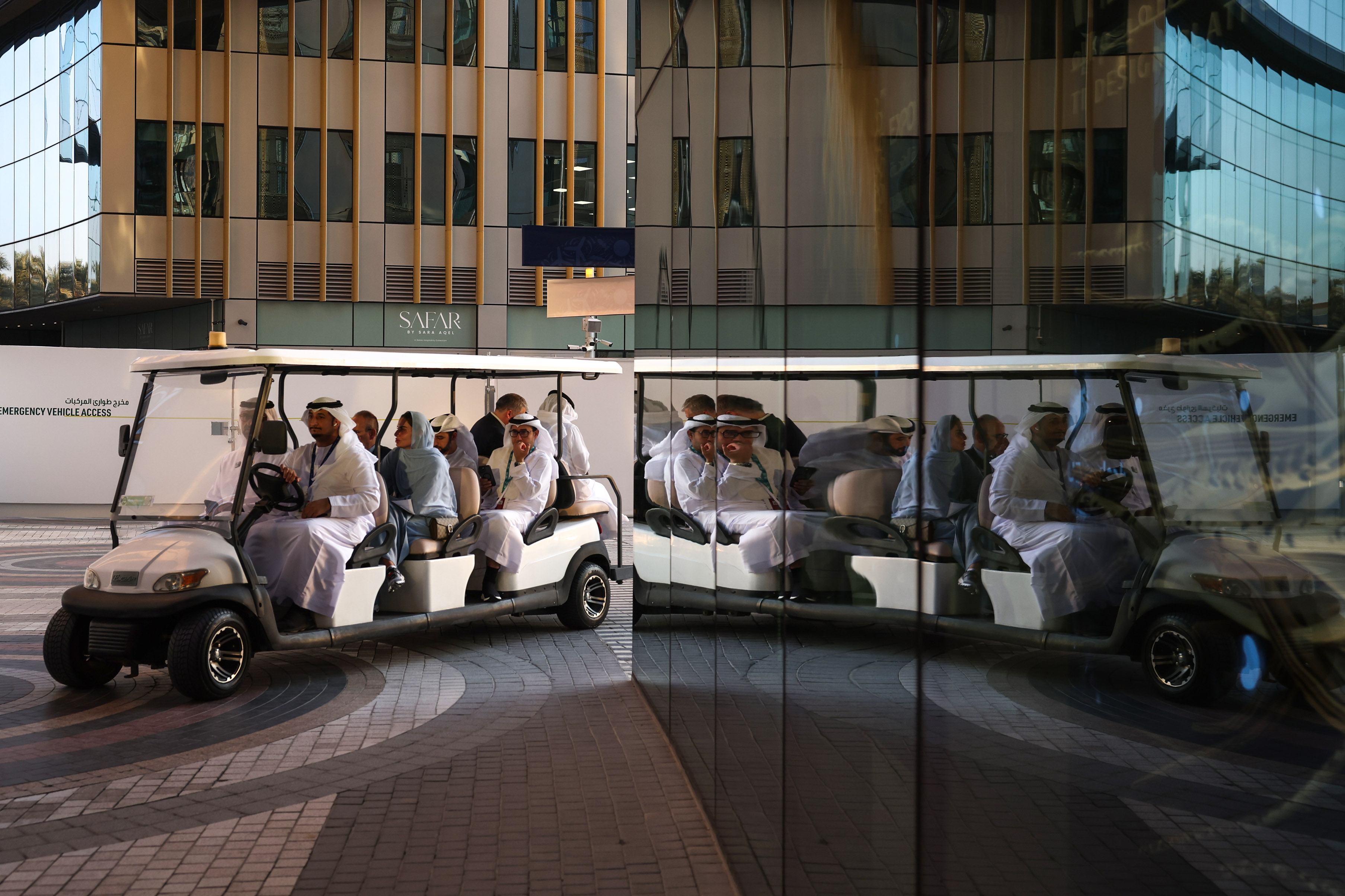绿色区域是一个免费进入的空间,供各国和公司展示其气候认证。沙特阿拉伯和中国在这里兜售他们的产品,一个巨大的充气熊猫在室外美食广场上方威胁着人们。陌生人挤在黄色高尔夫球车的后座上,将疲惫的与会者从一个半小时步行路程的中心区域运送到另一个中心区域。Masdar的员工,这家可再生能源公司的主席是COP28主席苏丹·阿尔贾贝尔,有专门为他们保留的高尔夫球车。