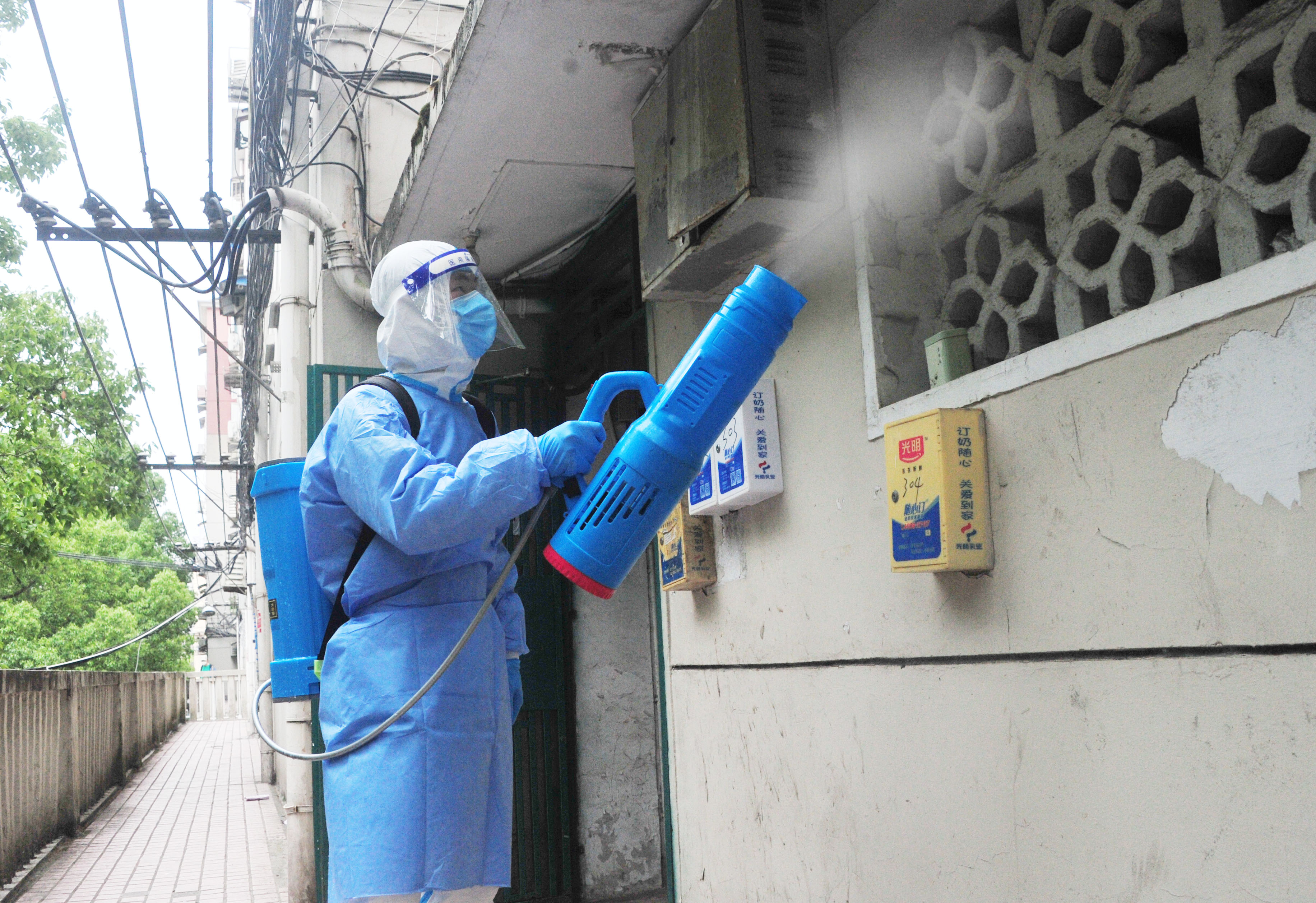 一名卫生工作者在2022年5月上海新冠封锁期间在一个封闭社区喷洒消毒剂。摄影师:杨建政/VCG/盖蒂图片社### 全面清零