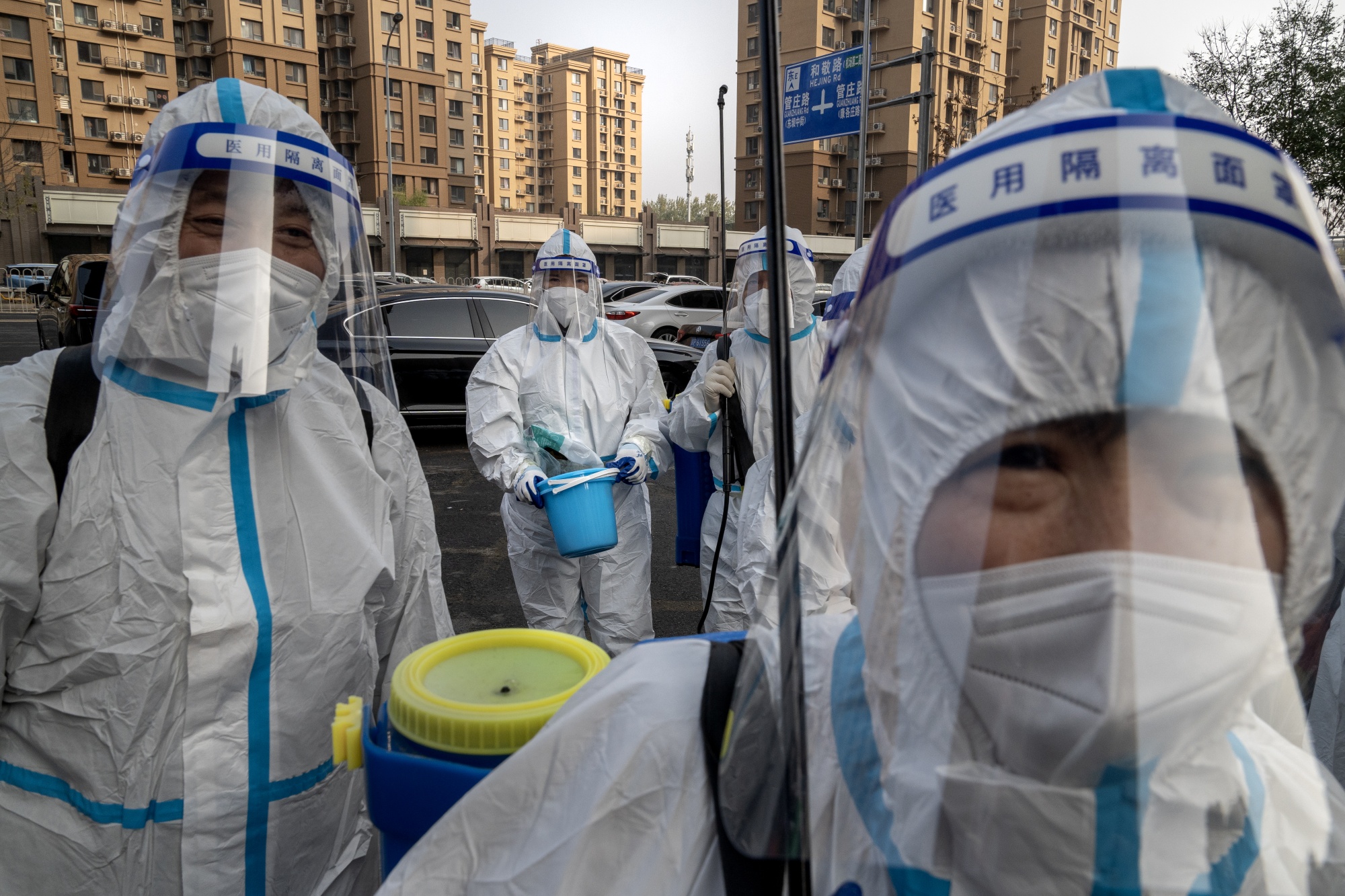 2022年11月,北京因Covid-19而被封锁的社区内穿着防护服的工人。