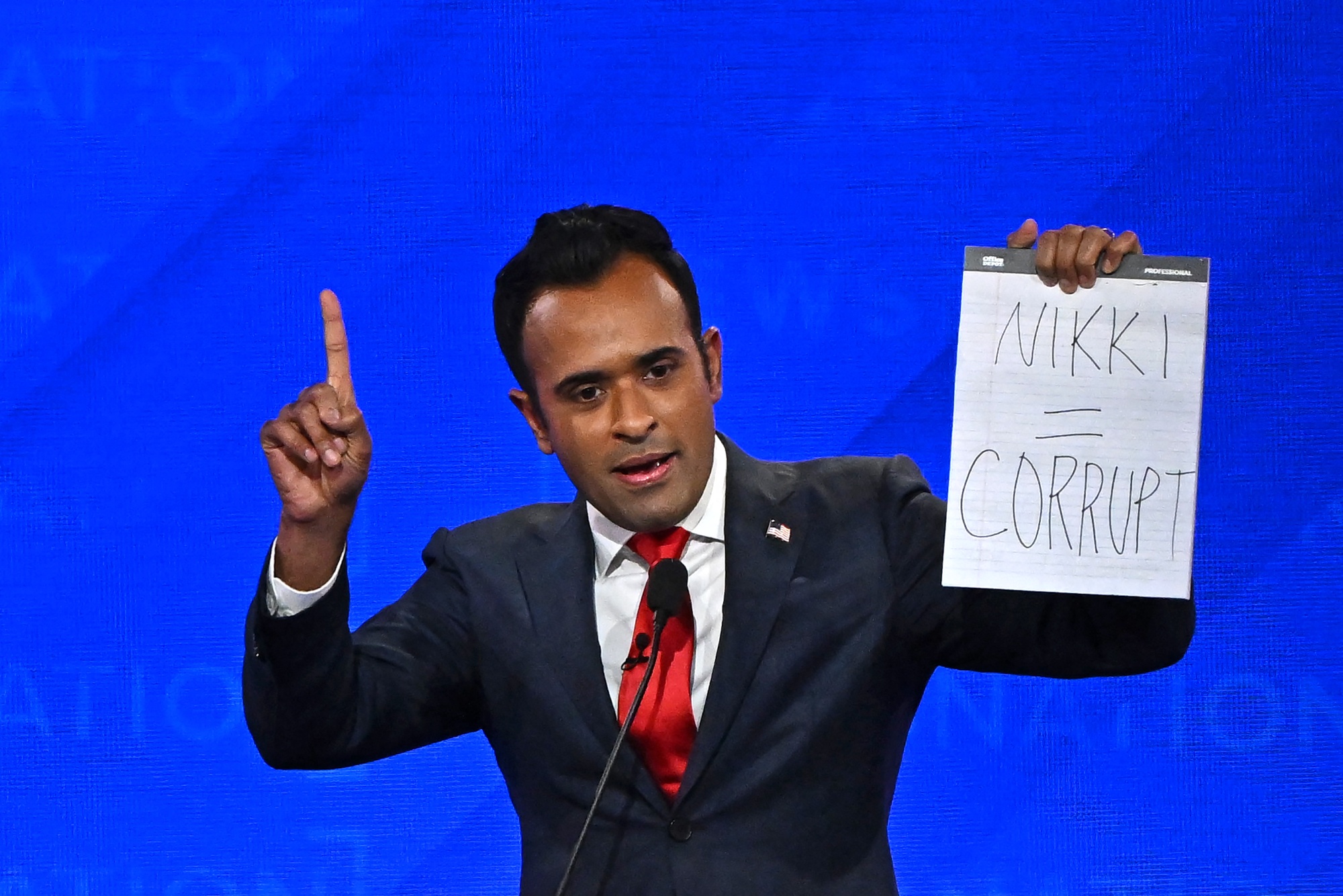 维韦克·拉马斯瓦米在辩论中举着一块写着“妮基=腐败”的牌子。摄影师:吉姆·沃森/法新社/盖蒂图片社主要捐助者们吹捧海利是特朗普的潜在替代者。最近几周,投资者比尔·阿克曼和摩根大通公司的杰米·戴蒙表示支持,领英公司的联合创始人里德·霍夫曼向支持她的超级政治行动委员会捐赠了25万美元。