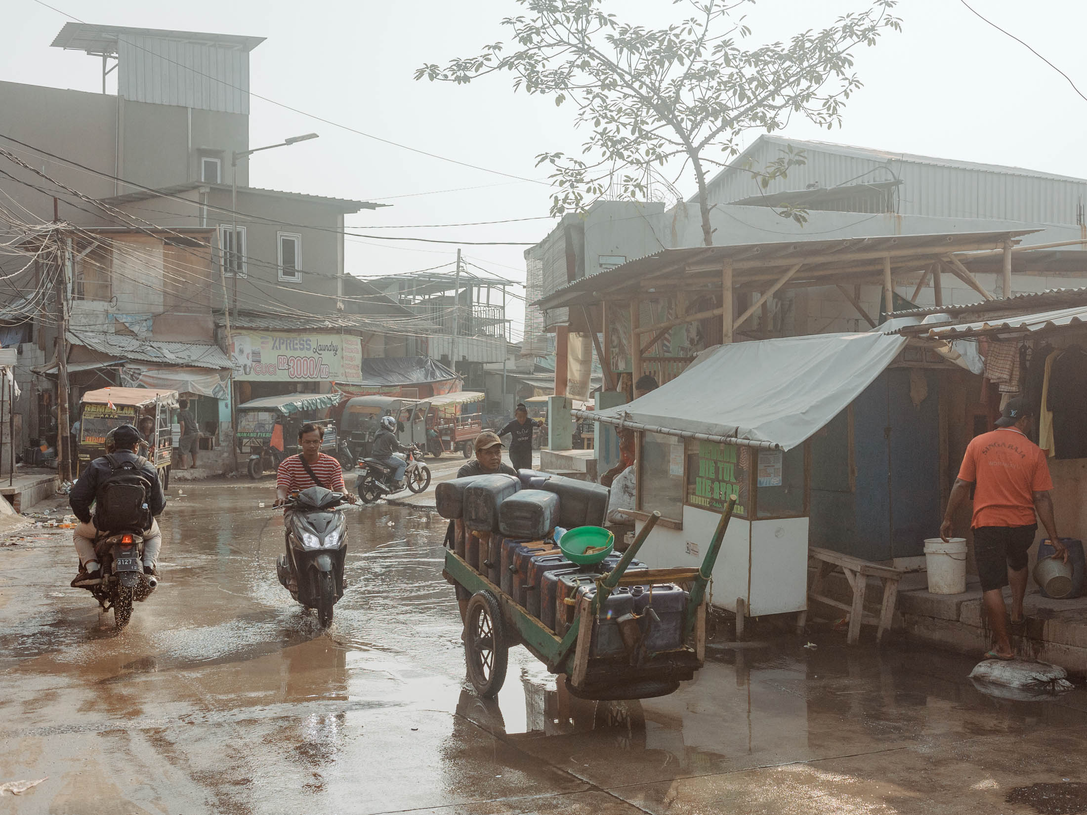 一个卖水的人推着他的马车朝着雅加达北部的Muara Angke加水站走去。摄影师:Muhammad Fadli
