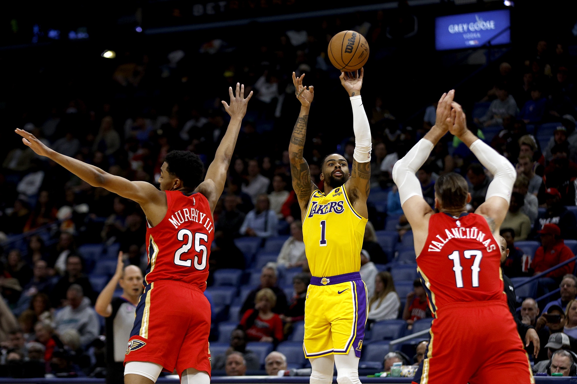 洛杉矶湖人队的D’Angelo Russell #1在新奥尔良鹈鹕队的Trey Murphy III #25上投篮。这两支球队将为NBA赛季首个常规赛期间的锦标赛决赛名额展开比赛。摄影师:Sean Gardner/Getty Images### 更多来自彭博社的内容