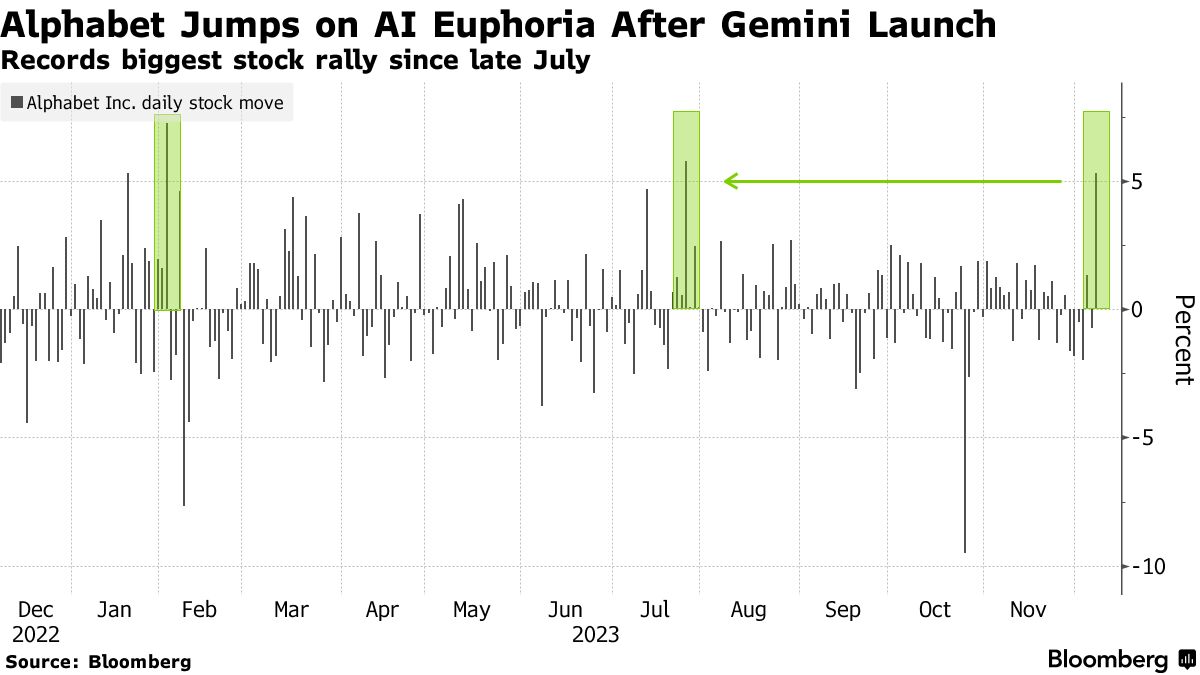 Alphabet Inc.的股价周四上涨了5.3%,是自7月底以来的最大涨幅,因公司发布的Gemini AI模型缓解了市场对其在人工智能高度竞争市场中地位的担忧。这次涨势帮助该股票增加了约870亿美元,推动其市值达到1.7万亿美元。谷歌母公司的股价周五下跌了1.7%。