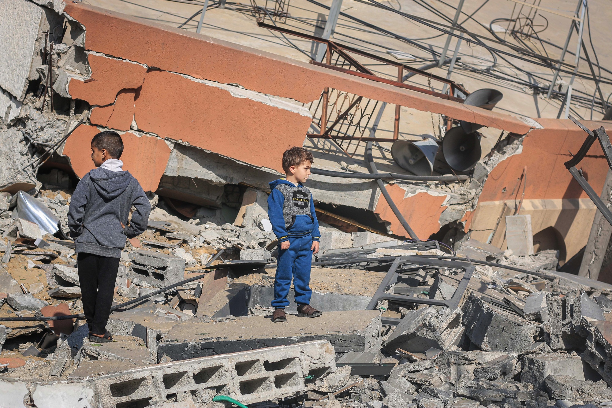 12月2日,以色列空袭后,加沙汗尤尼斯一座被摧毁的住宅楼中的巴勒斯坦儿童。摄影师:Ahmad Salem/Bloomberg### 全球必读