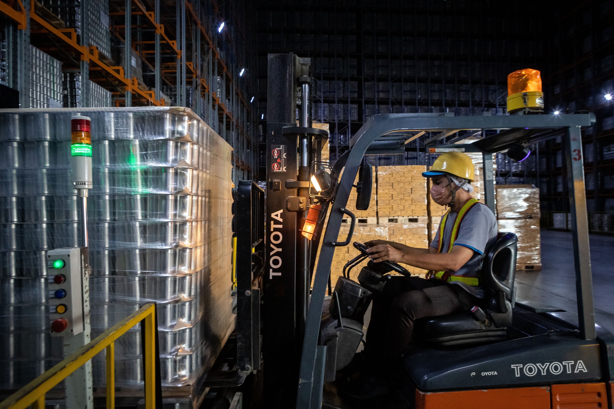 一名员工在泰国农康谷的设施内搬运椰奶。