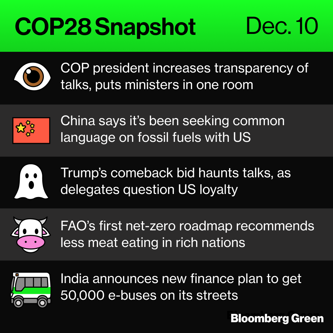 摄影师:Hollie Adams/Bloomberg 晚上好,来自迪拜。COP主席今天搅动了局势,把部长们引入一个开放的房间来解决分歧。阅读 这篇报道 并了解我们的COP28报道在这里。