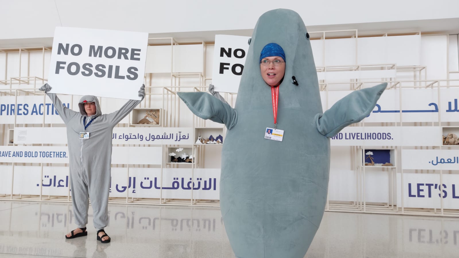 阿拉伯联合酋长国是世界上第二大野生海牛种群的所在地,但它们的生存环境受到威胁。在气温接近30摄氏度(86华氏度)的一天里,一名抗议者穿着海牛服装,呼吁保护这些动物的繁殖地。
