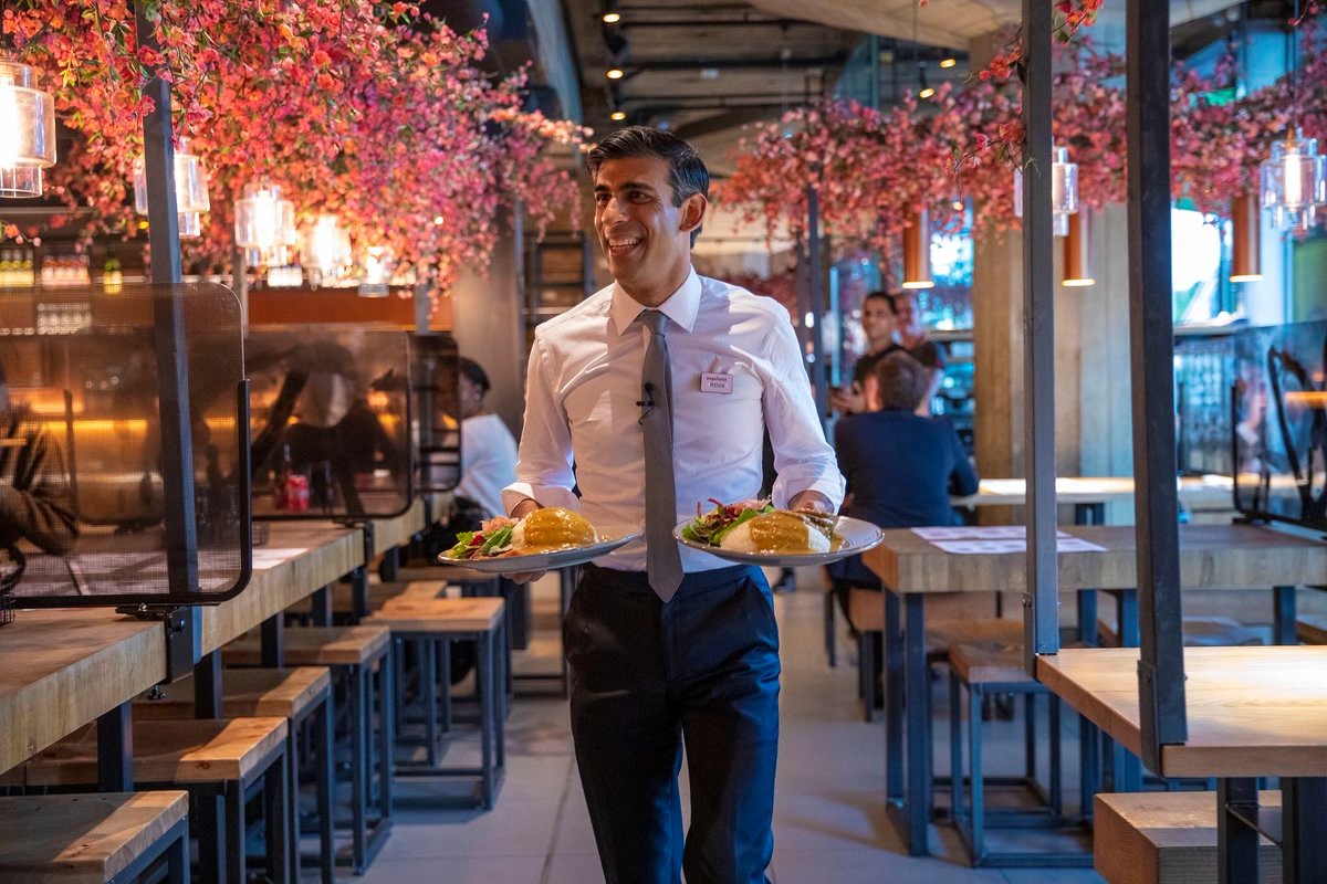这张照片捕捉到了拉希·苏纳克在疫情期间人气最高的时刻:经过数月的严格封锁后,英国当时的财政大臣面带微笑地端着两份咖喱煎猪排送到等待就餐的客人面前。在2020年7月的那家餐厅里,很少有人需要他的“拉希”名牌。