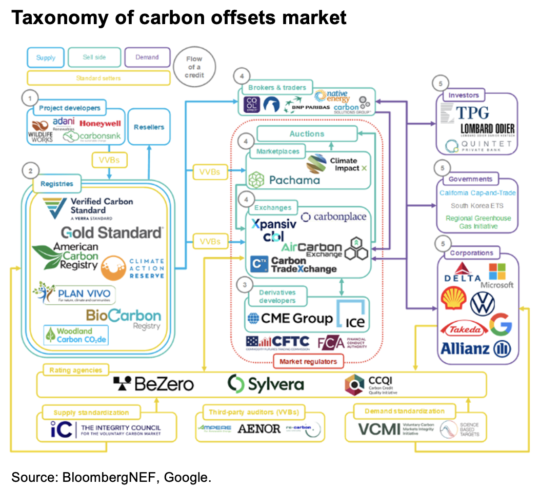 自愿碳抵消市场的目的是产生碳信用额度,然后通常由公司购买以抵消它们的排放。碳信用额度是一种纸质证券,据说代表减少或清除大气中一吨二氧化碳的项目所产生的,比如风电场或植树等。项目开发者与南极洲等中间商合作出售这些信用额度。购买者可以交易这些单位或用它们来抵消自己的排放,这种情况下,他们必须注销信用额度,以避免它被使用两次。