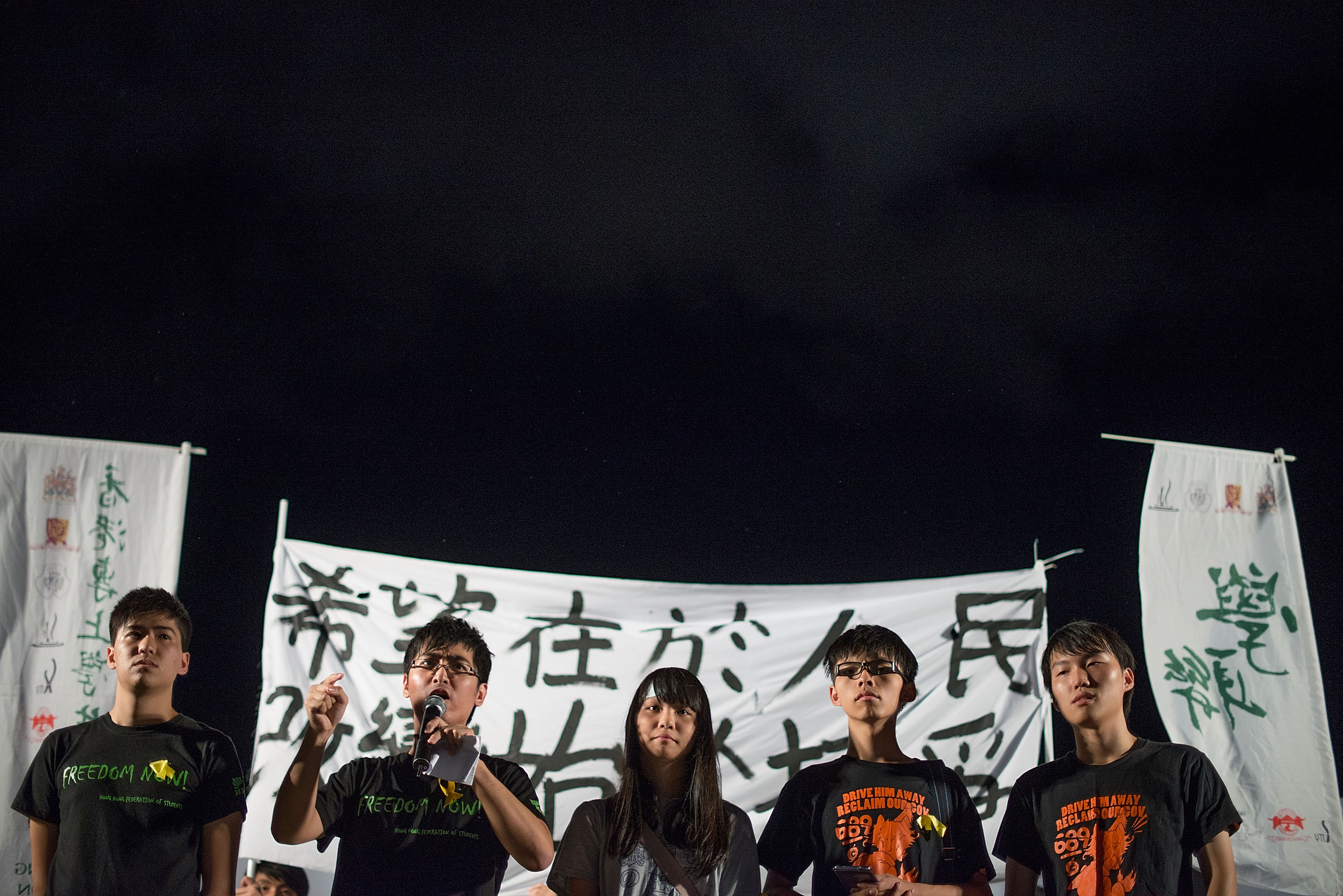 周庭(Agnes Chow)中间,与黄之锋(Joshua Wong)等学生活动人士在2014年8月31日香港政府办公楼外抗议。摄影师:安东尼·关/盖蒂图片社两年后,她与黄之锋和罗冠聪一起成立了政党“香港眾志”,她放弃了英国国籍,以便在2018年香港立法会的补选中参选,但因其政党支持香港自决而被禁止参选。
