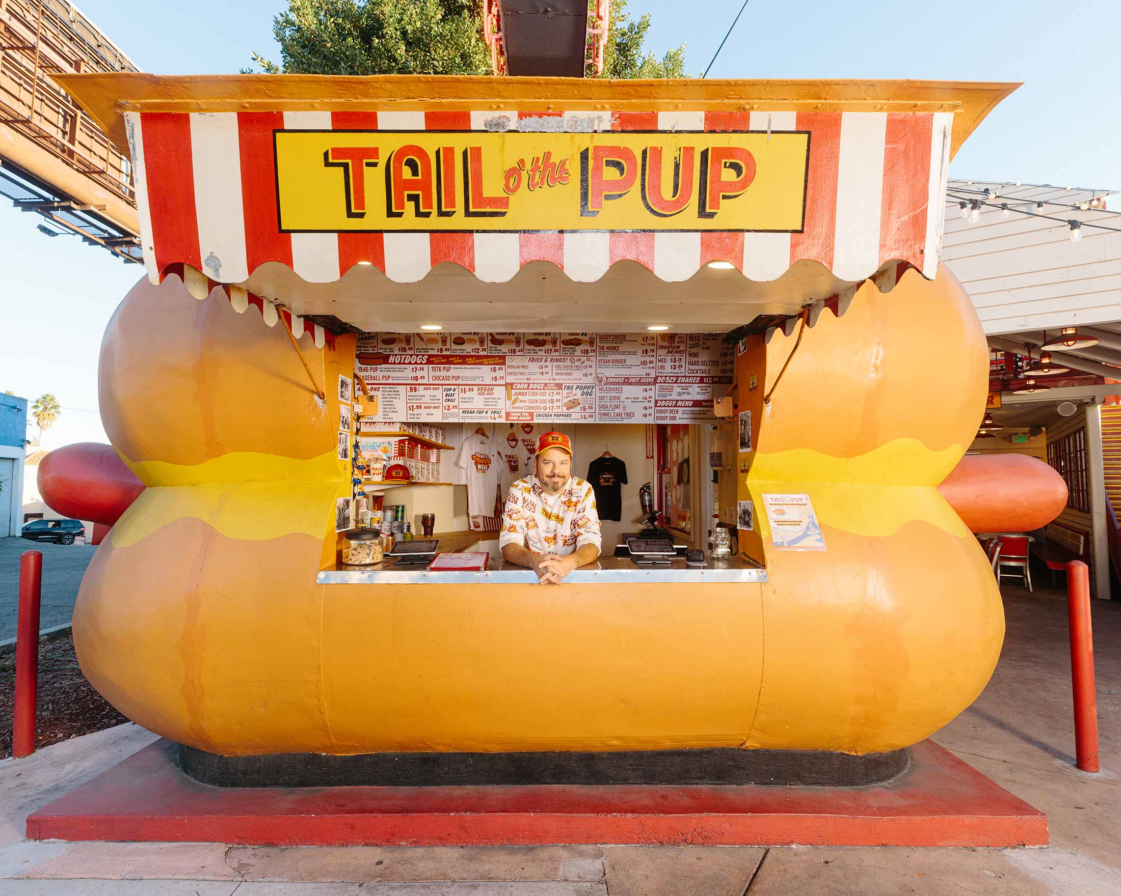 洛杉矶Tail o’ the Pup餐厅的合伙人Bobby Green。摄影师:Bloomberg Businessweek的Stella Kalinina在一个鞋子里工作是什么感觉?或者一个瓶子?一个桶?一个热狗?在20世纪20年代,在全美各地流行起来的模拟建筑——外观像它们销售的东西。如今,这些建筑对于在其中工作或租用建筑的人来说既是一种乐趣又是一种负担。