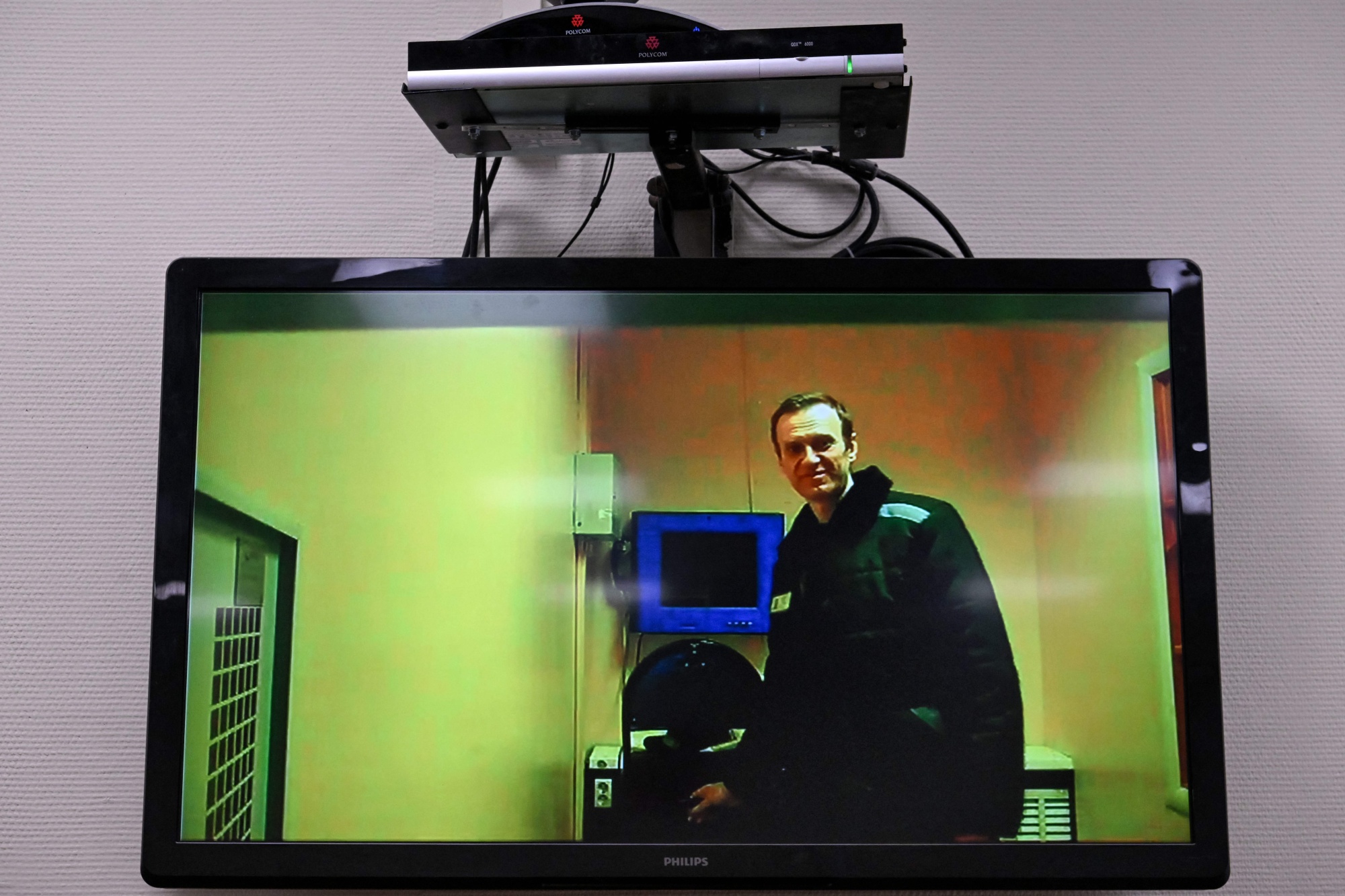 阿列克谢·纳瓦尔尼(Alexei Navalny)在莫斯科巴斯曼尼区法院4月份的一次听证会上,通过视频链接从他的监狱看到。