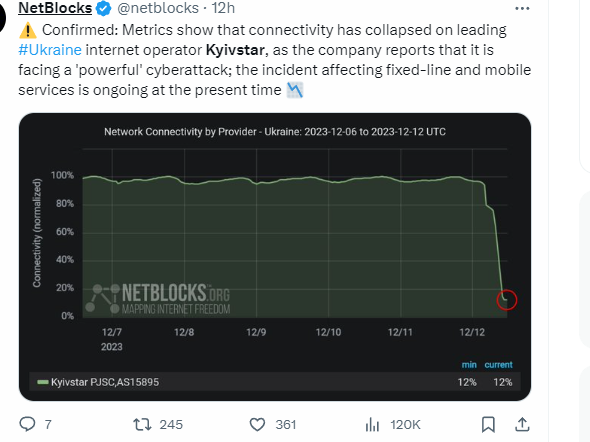 最初的猜测集中在例行技术故障上,但很快就变得清楚发生了更加险恶的事情。Kyivstar宣布遭受了一场“大规模的黑客攻击”,这使得其网络无法为其约2400万订户提供通信和互联网接入,占乌克兰人口的一半以上。