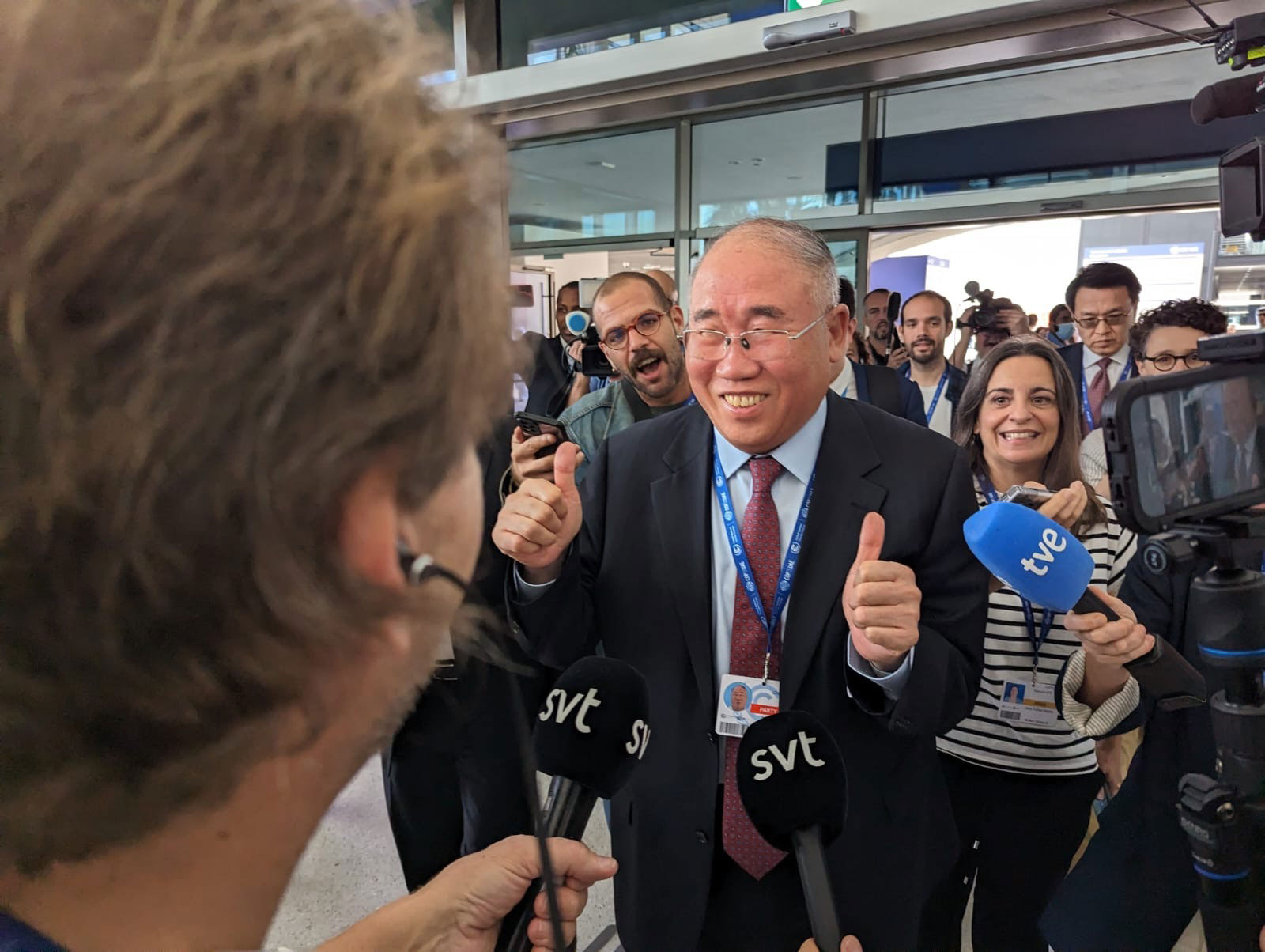 中国气候特使谢振华走进即将开始的全体会议,面带笑容,竖起大拇指。他告诉记者,他对最新的文本感到高兴。