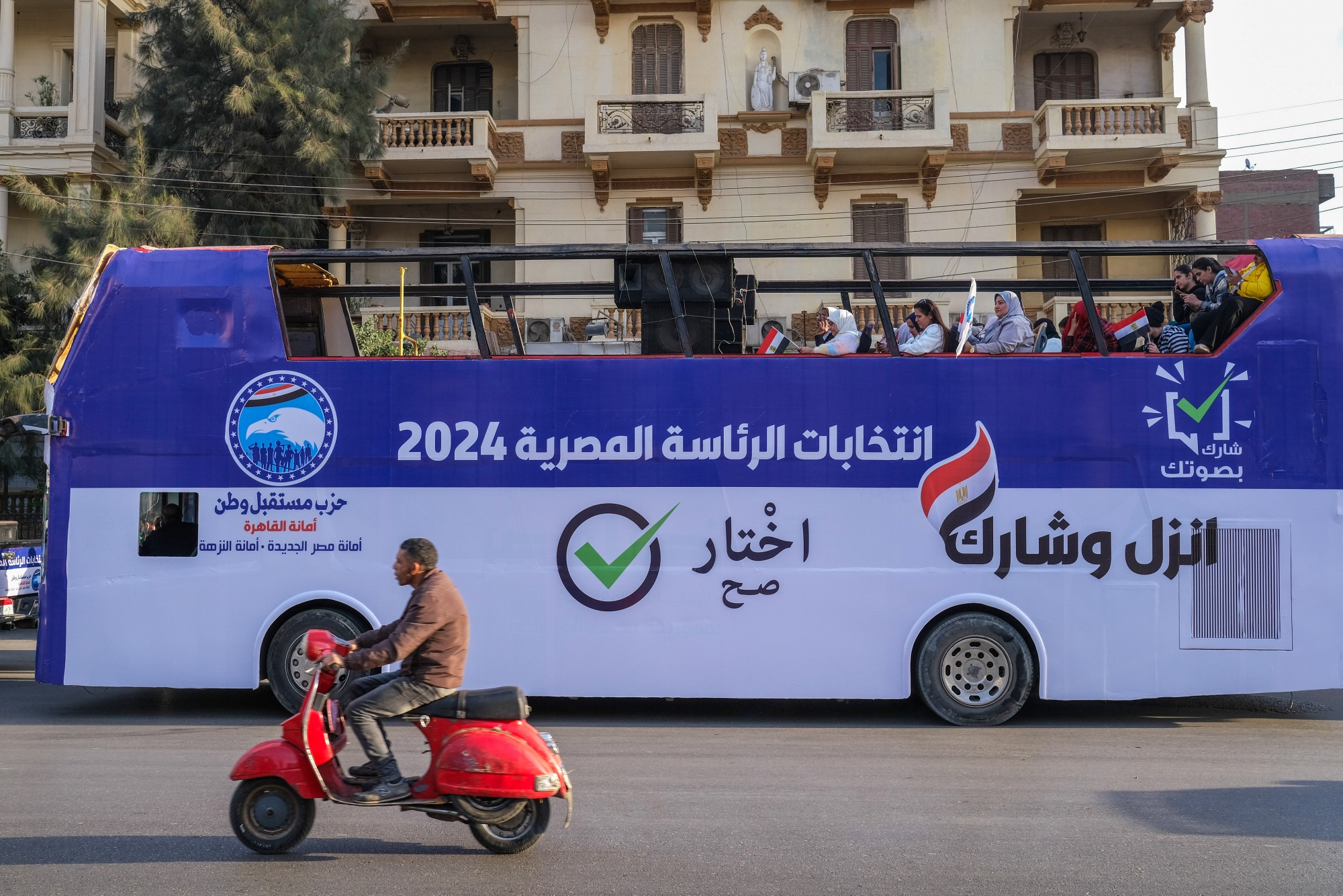 在开顶竞选巴士上,呼吁开罗赫利奥波利斯地区的居民投票。摄影师:Islam Safwat/Bloomberg埃尔-塞西在从军事生涯转向政治之前,也面临与以色列-哈马斯战争有关的挑战,这场战争使埃及在该地区的外交角色得到复兴。