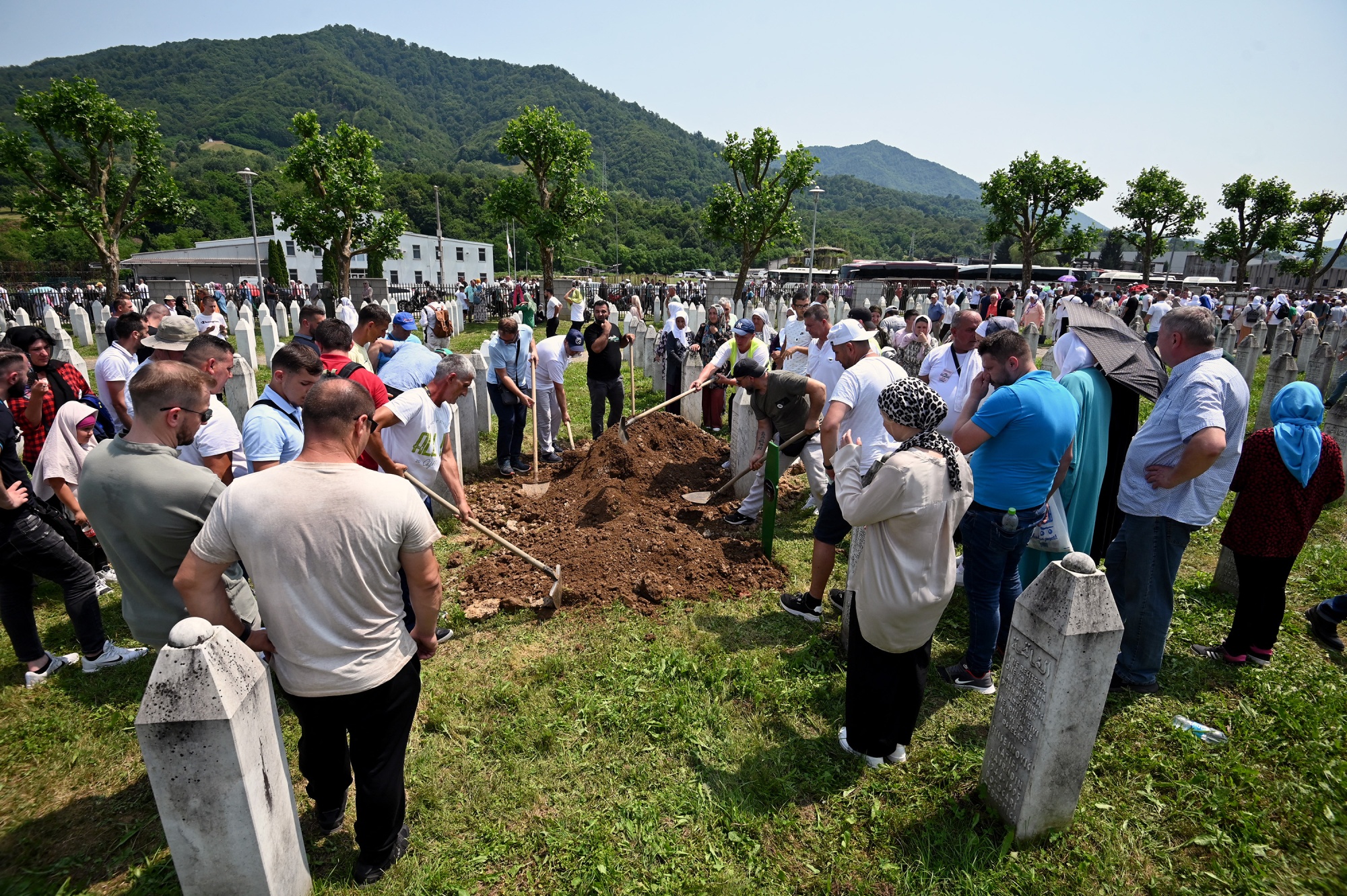 1995年斯雷布雷尼察大屠杀的幸存者在7月11日在斯雷布雷尼察附近的波托查里纪念公墓为亲人安葬遗骸。摄影师:埃尔维斯·巴鲁克奇奇/法新社/盖蒂图片社这也助长了多迪克的势力,这位64岁的政治家利用波斯尼亚1995年的和平协议中规定的结构,主张波斯尼亚塞族领土的分离。