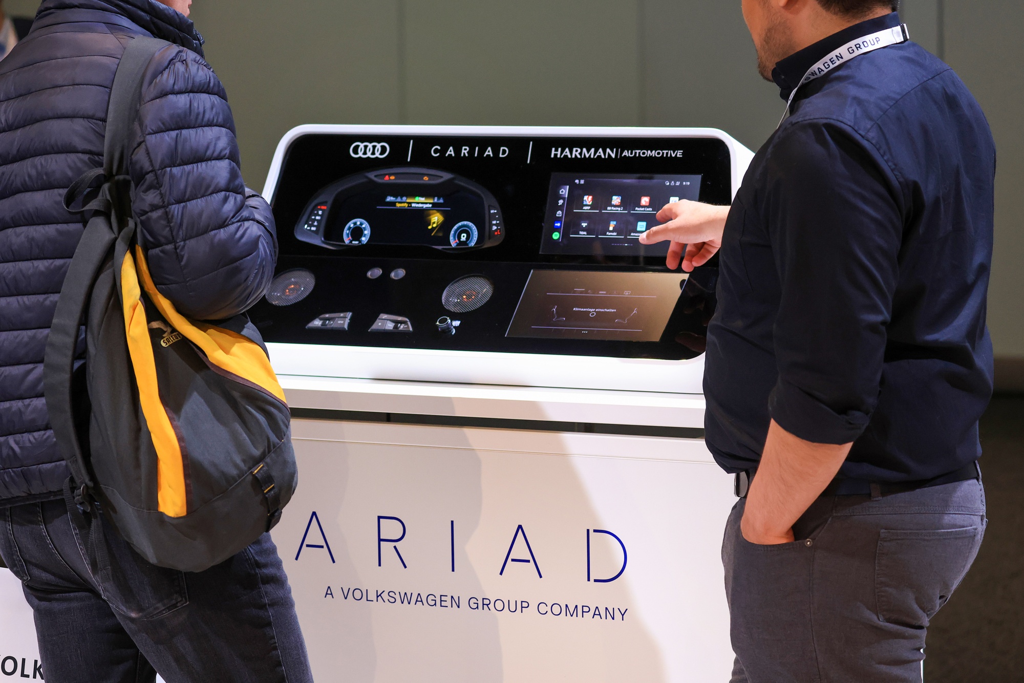 在柏林举行的大众汽车股份公司年度股东大会上,展示了使用Cariad软件的技术展台。