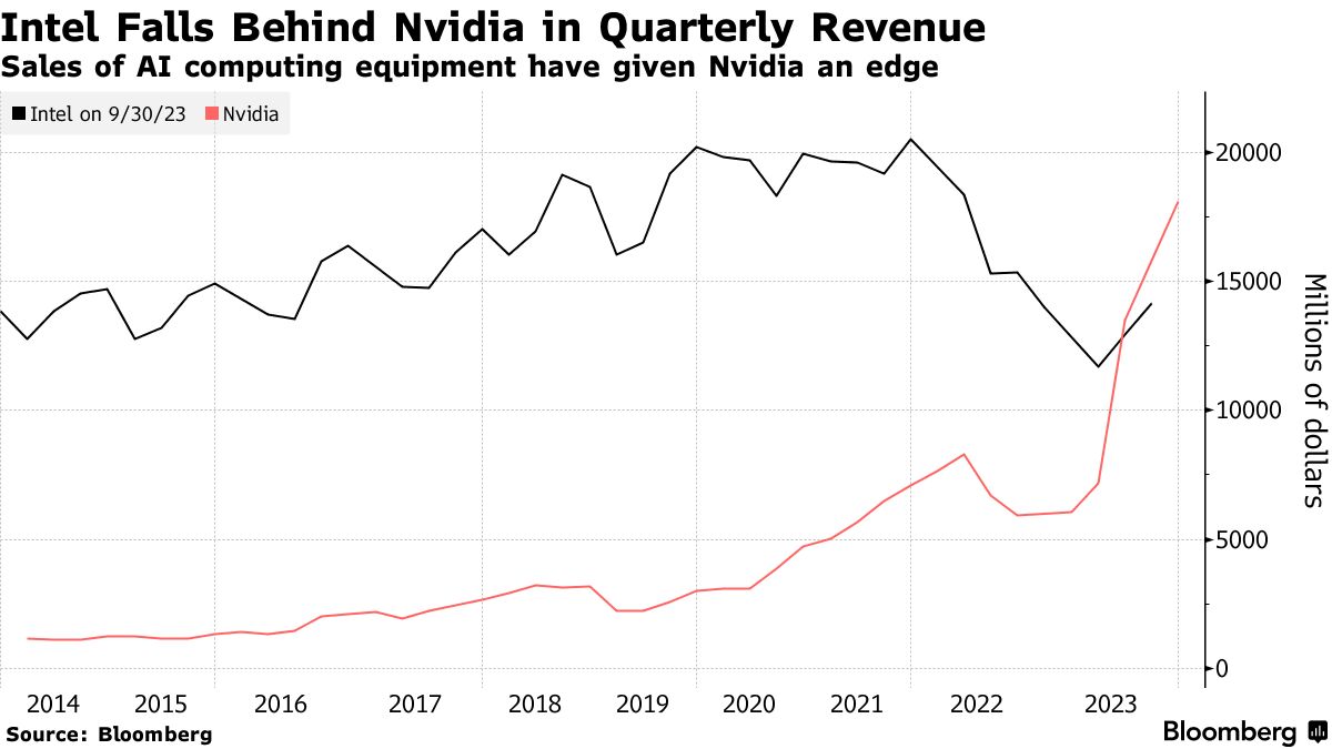 与此同时,英伟达已成为数据中心芯片领域的主导力量,其人工智能加速器产品推动销售额飙升,使英伟达的估值超过了1.1万亿美元。根据分析师的预测,英伟达今年将首次超过英特尔的总收入,准备超越英特尔。几十年来,英特尔一直是世界上最大的芯片制造商。