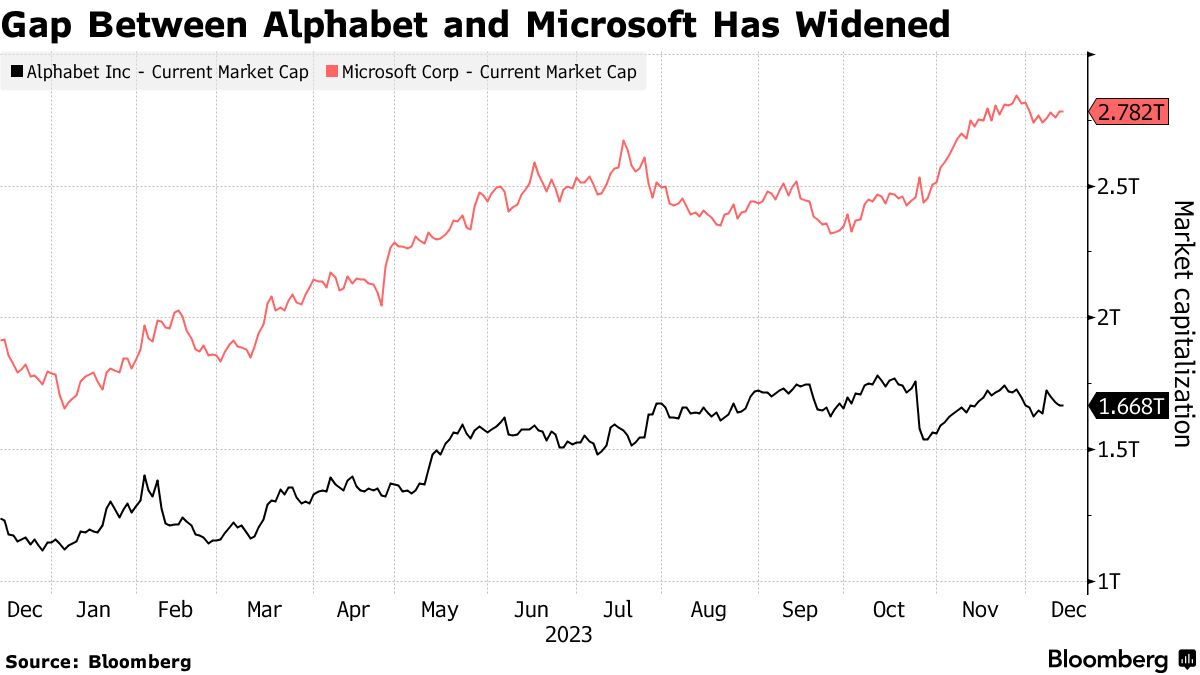 第三季度的收益季似乎突显了人们对Alphabet地位的担忧,微软吹捧人工智能对Azure增长的日益影响,而谷歌云的业绩令人失望。在股市上,这两家公司之间的差距已经扩大,微软今年连续创下一系列记录。Alphabet仍然比2021年的历史最高价低约11%。