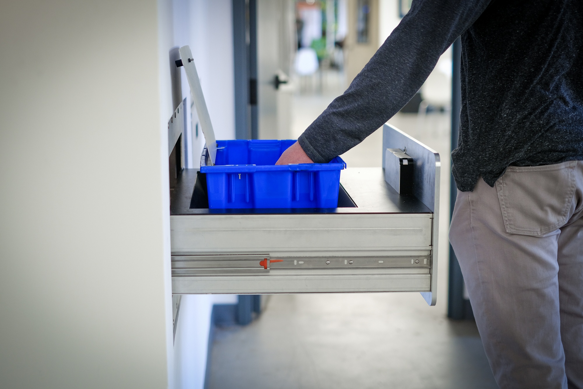 午餐穿越长达三分之一英里的隧道,出现在一个抽屉里。图片来源:Thomas Godden/Pipedream管道宽度为18英寸,足够容纳40根香蕉,电动车可以以每小时45英里的速度携带高达40磅的货物。整个行程不到五分钟,再加上发送机器车返回的时间。Branham表示,这将有助于Curiosity Lab节省自己食品和饮料库存的成本,并为科技实验室成员提供福利,他们无需离开校园去寻找零食。(Pipedream Labs支付了试点的全部成本,顾客每次送货额外支付25美分。)