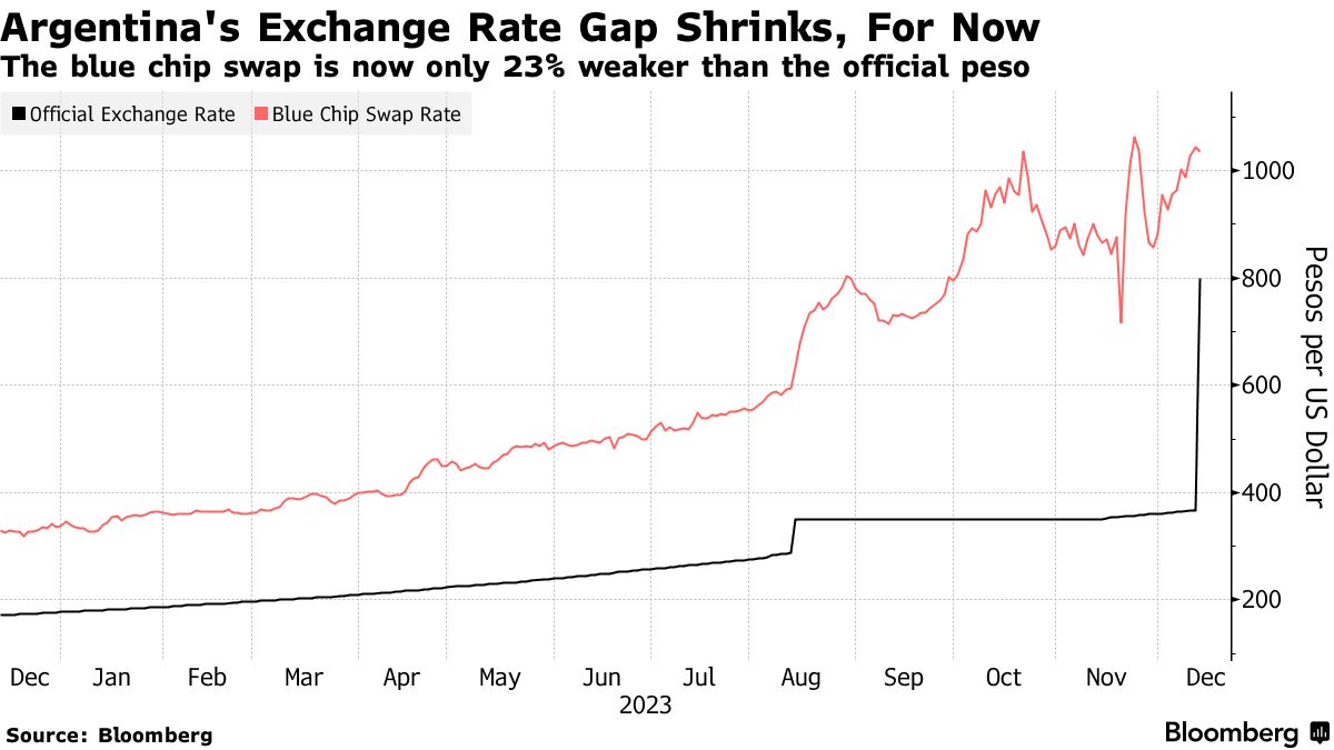 这些保证帮助保持比索在阿根廷人用来规避货币管制的所谓蓝筹股掉期市场上保持稳定。因此,官方汇率的暴跌使平行汇率大约贬值了23%,从米莱当选后的几天内的65%附近的差距下降。