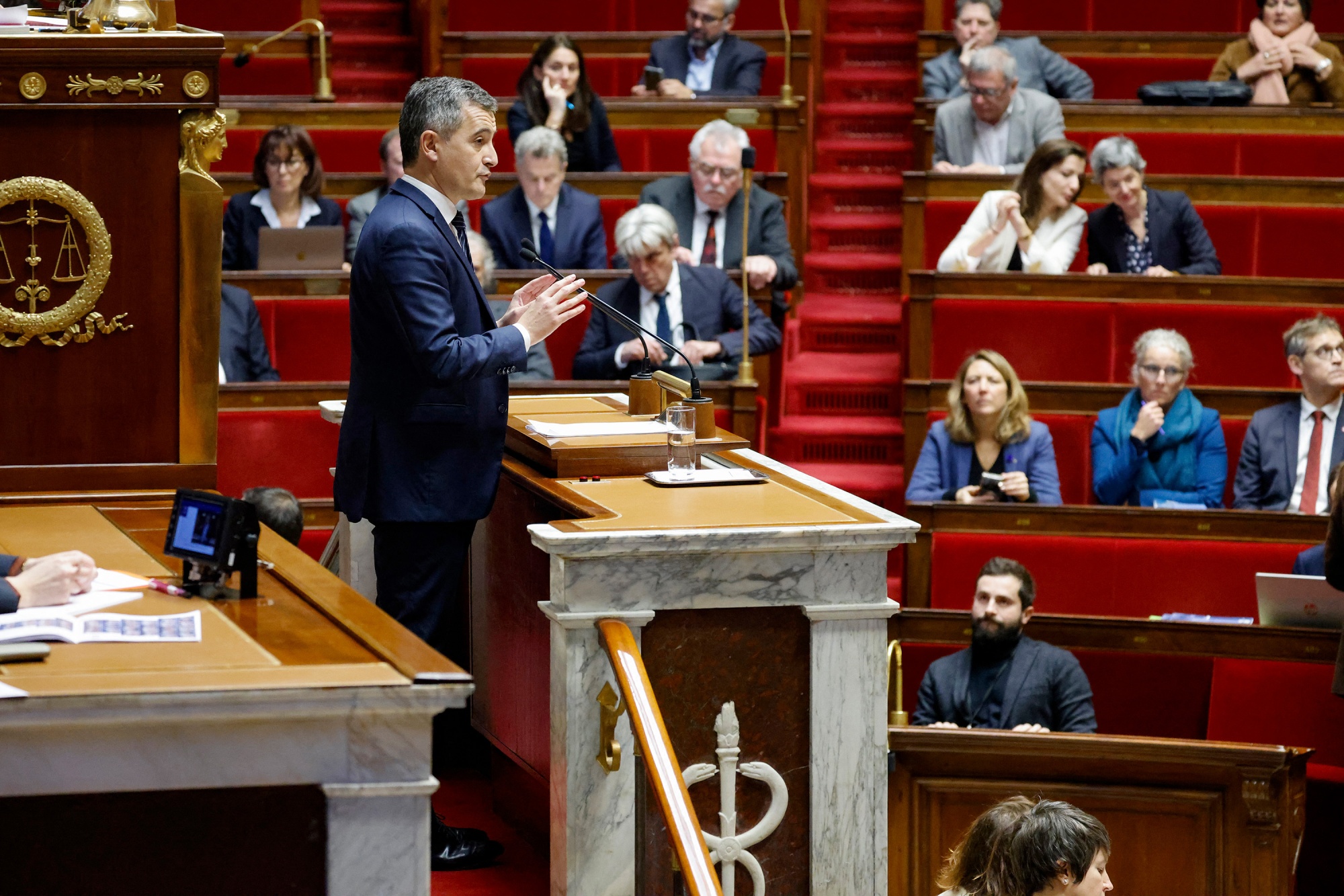 杰拉尔德·达尔马宁在巴黎国民议会就移民控制法草案进行辩论时发言,时间为12月11日。摄影师:Ludovic Marin/AFP/Getty Images总统已经交给内政部长杰拉尔德·达尔马宁(被视为2027年潜在的继任者)建立多数席位的任务。然而,三分之二的共和党人支持所谓的解雇动议。