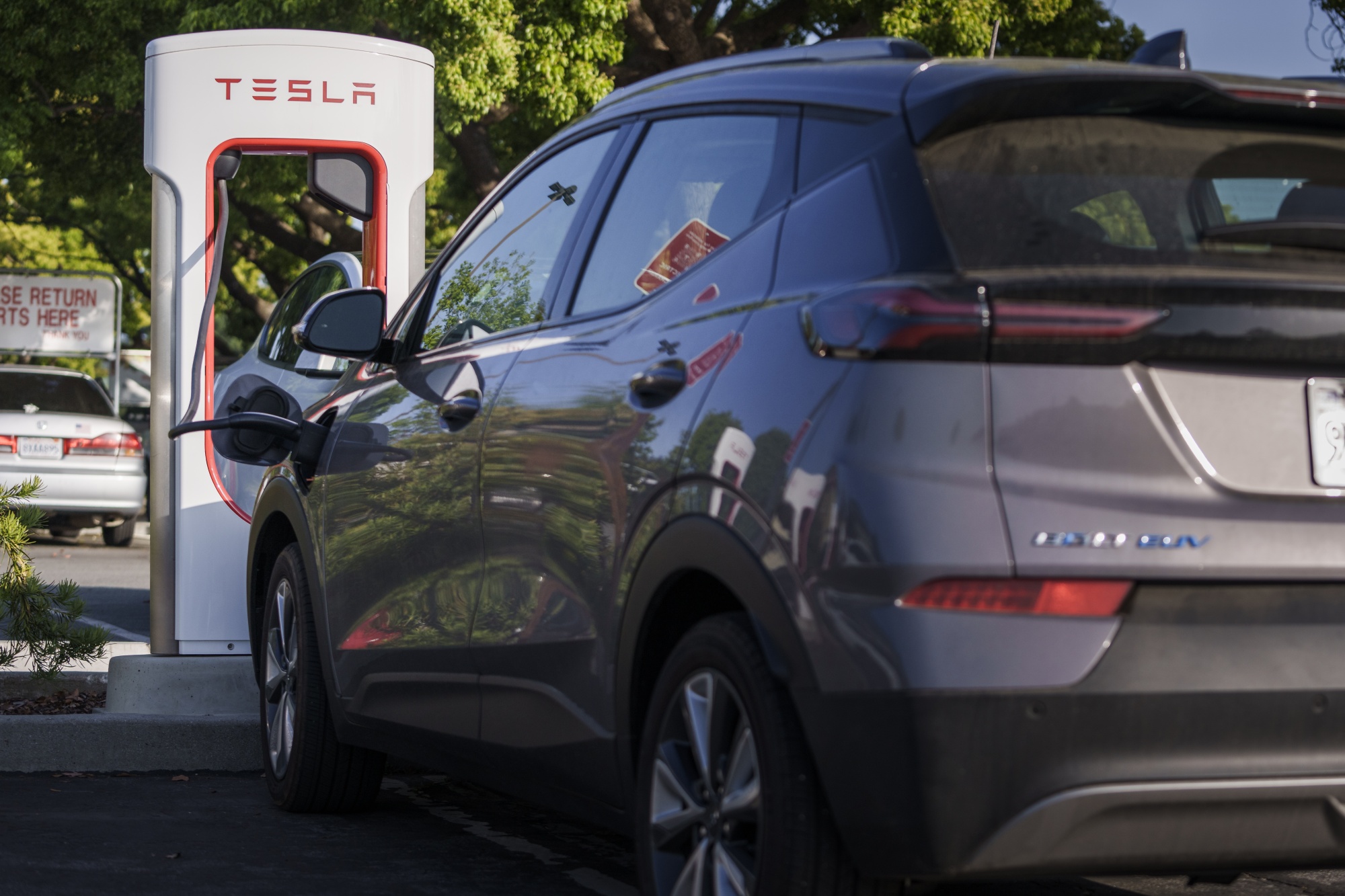 一辆雪佛兰Bolt电动汽车在加利福尼亚州斯科茨谷的特斯拉超级充电站充电。