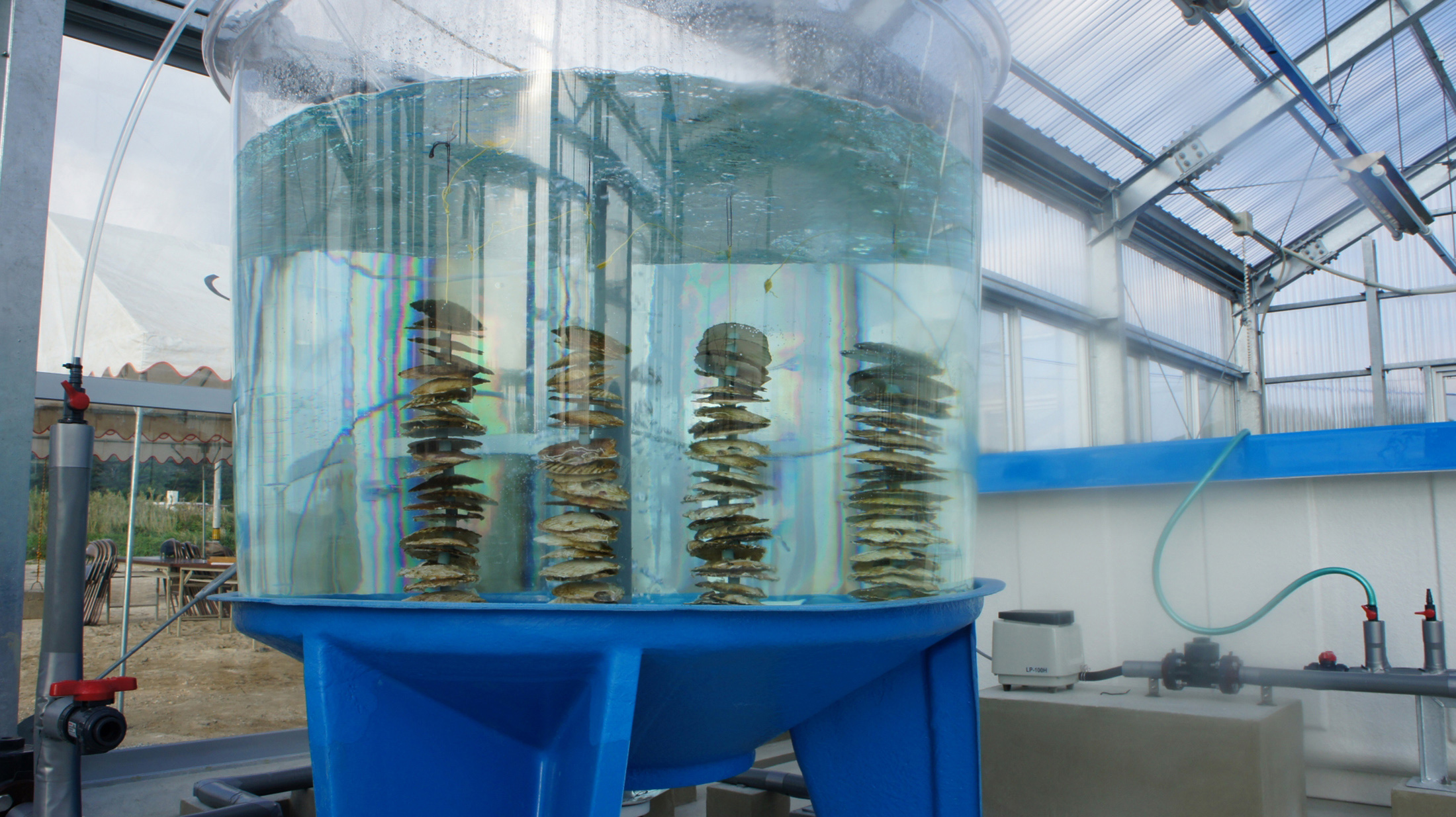 冲绳的 General Oyster 公司陆地养殖场的一个水箱。来源:General Oyster 公司。吉田的主要挑战一直是确保以足够低的成本获得饲料,使养殖业务能够盈利。一只牡蛎每小时可以过滤约20升(5加仑)海水,吸收微生物生长,但是该设施使用的深海水缺乏足够的营养。他说,从其他地方购买饲料成本太高,因此公司在单独的水箱中生产饲料,重新创造海水中的营养物质,而不含有污染物。