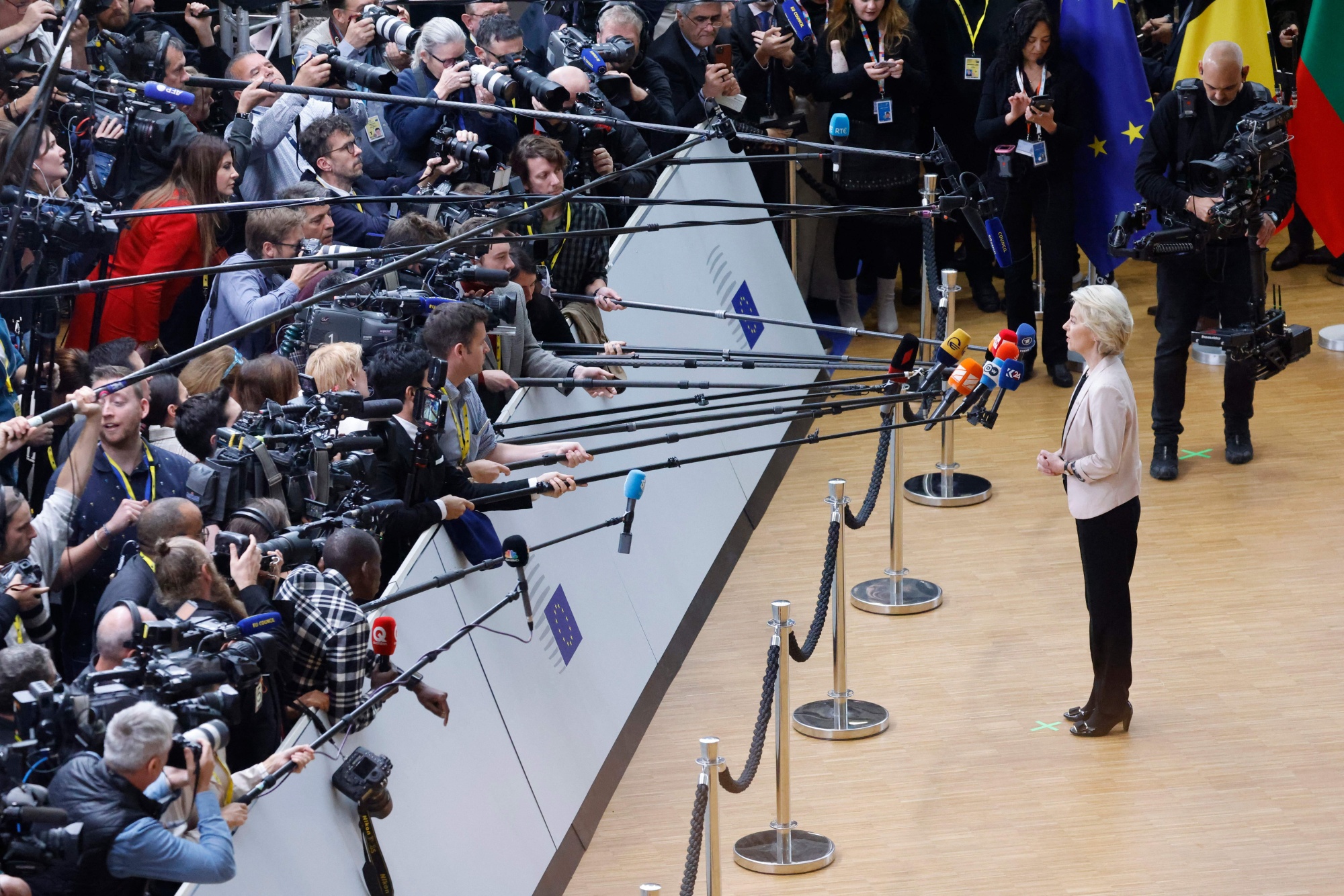 乌尔苏拉·冯·德·莱恩10月26日在布鲁塞尔欧洲理事会大楼向媒体发表讲话。